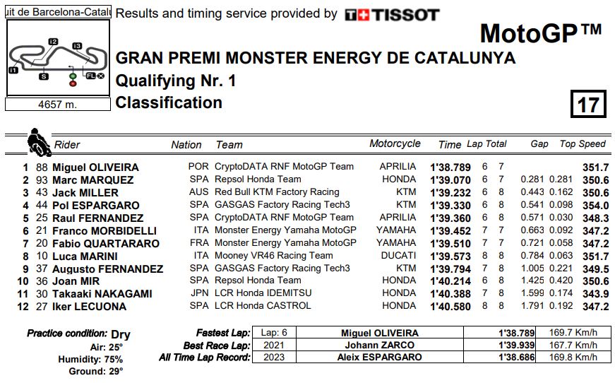 Qualifiche spettacolari a Barcellona, ad avere la meglio è Bagnaia che si tiene dietro Espargaro, Oliveira, autore di un sorpasso da urlo su Marquez all’ultima curva, e Vinales. Bene DI Giannatonio, mentre sono andati stranamente male i duel team VR46. 12° Marc Marquez, che è passato alla Q2 grazie a Miller.