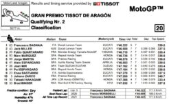 Qualifica positiva per Marc Marquez, che sfiora la prima fila per 17 millesimi e si deve accontentare della quarta posizione nella griglia di partenza di domani. Il portacolori del team Honda Repsol aprirà una seconda fila completata da Jorge Martin (Ducati Pramac) ed Aleix Espargaro (Aprilia Gresini). Classifica decisamente allungata dalla terza fila in poi: Mir è settimo al termine della Q2 con tre decimi di ritardo da A. Espargaro e oltre otto da Bagnaia. Il Campione MotoGP in carica sarà affiancato in griglia di partenza da Pol Espargaro ed Enea Bastianini.