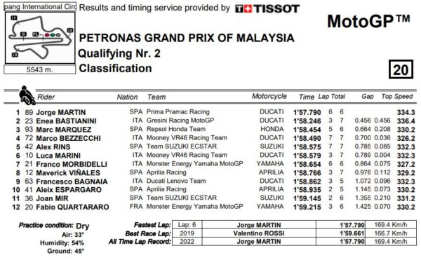 C’è una splendida luce a Sepang terminate le qualifiche della MotoGP, viene dal sorriso di Jorge Martin dopo il clamoroso 1’57”790 registrato in Q2. Lo spagnolo del team Pramac si è così preso pole position del GP della Malesia, terza stagionale dopo Losail e Austin, e record assoluto del circuito di Sepang, con ampio margine su tutti gli altri piloti. Il secondo tempo infatti è di Enea Bastianini, che paga però quattro decimi e mezzo al compagno di marca, mentre Marc Marquez, arrivato dalla Q1, è terzo a 664 millesimi. Prima fila un po’ a sorpresa quindi.