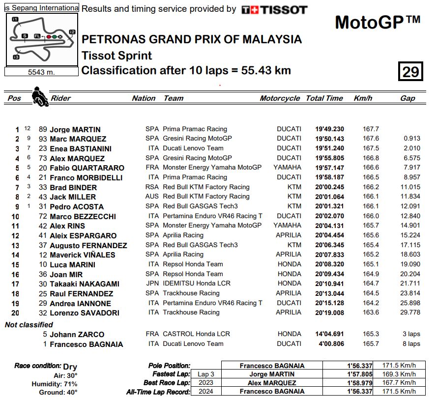 Seconda posizione posizione per Marc Marquez, che alla fine è riuscito a chiudere a meno di un secondo da Martin, e terza per Enea Bastianini, staccato di 2″ dalla vittoria, che hanno così accompagnato Martin sul podio della MotoGP Sprint in Malesia, segnata da poche emozioni per l’assenza di duelli e sorpassi dopo i primi due giri.