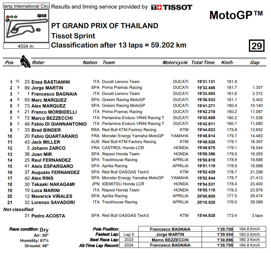 Doppia Top5 per il team Gresini, grazie al 4° posto di Marc Marquez (+5”4) e al 5° del fratello Alex (10″1). Sesta posizione per Franco Morbidelli, che chiude davanti ai due del team VR46, Bezzecchi e Di Giannantonio (+11”6). Nona posizione per Brad Binder, che compelta la zona punti in sella alla KTM RC16. Ad accomunare tutti i primi otto classificati di questa Sprint della MotoGP in Thailandia è Ducati, che infatti lascia solo le briciole alle Case concorrenti. Era dal Gran Premio motociclistico di Catalogna del 1996 che una Casa, in quel caso fu Honda, non piazzava otto piloti davanti a tutti in gara.