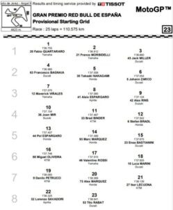 Quarto tempo per Bagnaia, che domani aprirà la seconda fila seguito da Nakagami e Zarco, col francese del team Pramac a 299 millesimi dal connazionale in Pole. Terza fila per un ombroso Maverick Vinales, a cui faranno compagnia i connazionali A. Espargaro e Rins, e quarta per il campione del mondo in carica Mir, che non va oltre il decimo tempo a 4 decimi, seguito da Binder che si limita a replicare il tempo fatto in Q1 e Bradl.