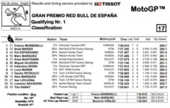Dopo un momentaneo secondo tempo durante il primo run, nel secondo Morbidelli è riuscito a firmare il miglior riferimento della Q1, un 1’36”916 che gli ha garantito la promozione grazie ad una coppia di soft nuove. Promosso anche Brad Binder, secondo a oltre quattro decimi. Primo degli esclusi è stato Pol Espargaro, che chiude a sei centesimi dal sudafricano e riesce a tenersi dietro il malandato compagno Marc Marquez, regolarmente in pista dopo il botto nelle FP3.