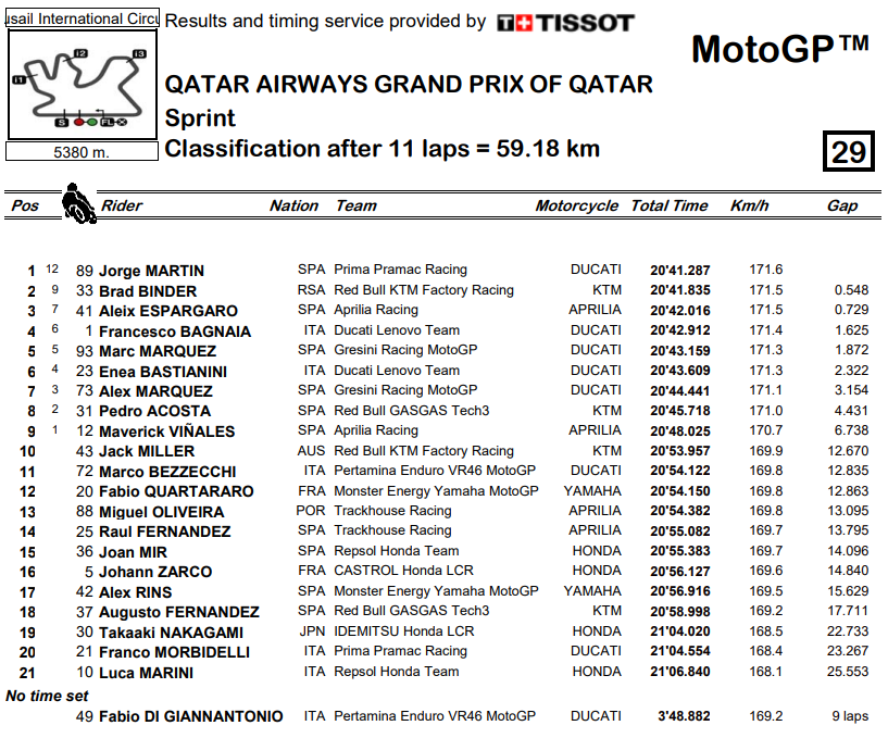 Jorge Martin sembra inarrestabile in Qatar, dopo la pole è sua anche la prima Sprint stagionale della MotoGP! Secondo Binder che resiste a Espargaro, in gran forma nel finale. Quinto Marc Marquez tra i due ducatisti ufficiali del team Lenovo, Bagnaia e Bastianini. Bene Acosta, male Bezzecchi e Marini. Caduta per Di Giannantonio che rischia…