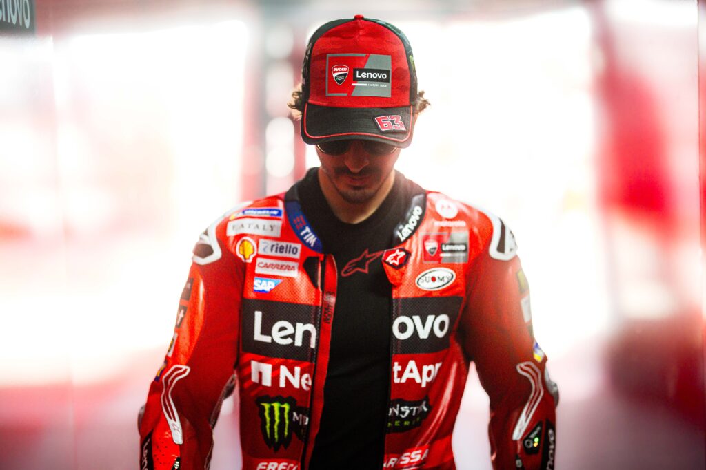 Si è parlato molto del fatto che per questa Sprint Bagnaia ha utilizztao l’opzione hard all’anteriore, al contrario dei fratelli Marquez che hanno usato, con maggior successo, la Soft. Bagnaia ha affrontato anche questo argomento, spigando come per una questione di feeling e stile di guida la Hard, anche per via di una carcassa più sostenuta, sia la sua preferita. “Loro due (i fratelli Marquez, ndr) han fatto sicuramente meglio di me, non c’è altro da dire. Son partiti meglio e hanno sfruttato meglio i primi giri. A me è mancato lo spunto iniziale e poi non mi aspettavo il calo della gomma dura” ha detto Pecco. “Non so se è una questione di pressioni o se la dura, per spingere uguale, bisogna forzarla un po’ di più. Io credo che avrei scelto comunque la dura.“