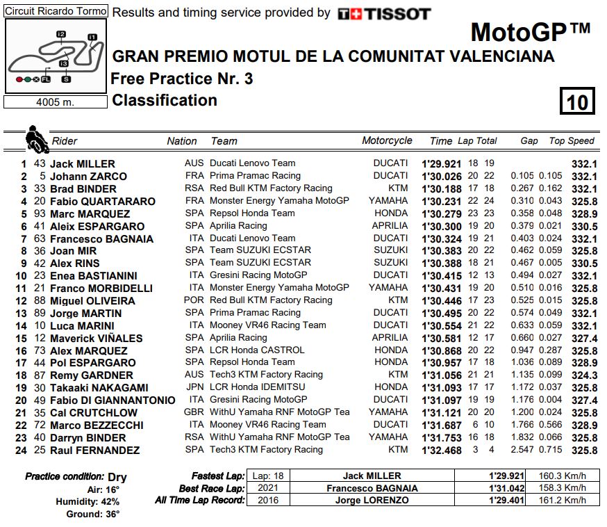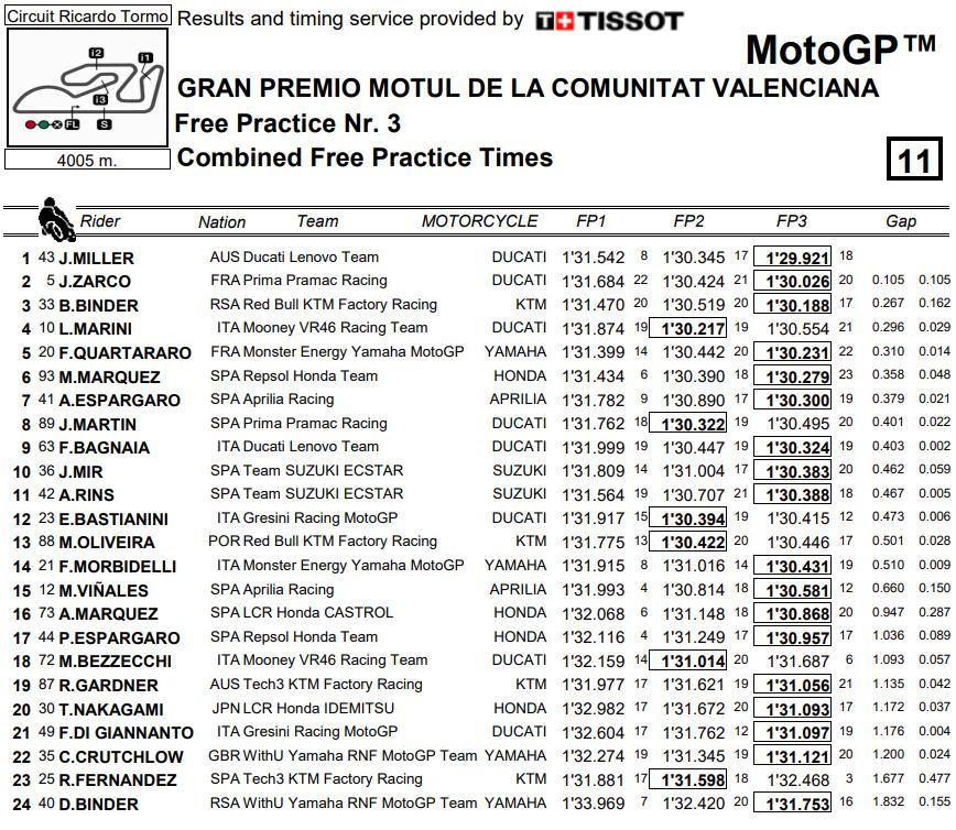 Terminate le FP3 della MotoGP, passata la bandiera a scacchi il più veloce è stato Jack Miller con un ottimo 1’29”921 che lo pone al vertice anche della classifica combinata. Secondo tempo per Zarco che paga un decimo al compagno di marca e nel finale, rimasto senza benzina, si è fatto riaccompagnare ai box da Bagnaia, mentre Brad Binder si conferma in grande spolvero. L’alfiere della KTM, le cui MotoGP a Valencia si trovano sempre a proprio agio, ha chiuso col terzo tempo seppur a oltre due decimi e mezzo da Miller. Quarto tempo con un gap di tre decimi per Quartararo che si tiene dietro Marc Marquez ed Aleix Espargaro. Settimo tempo per Francesco Bagnaia (+0”400) davanti ai piloti della Suzuki, con Mir a precedere Rins, mentre il promesso compagno Bastianini chiude decimo. Però Alex ed Enea non sono riusciti a prendersi un posto in Q2, a differenza di tutti quelli che li hanno preceduti.