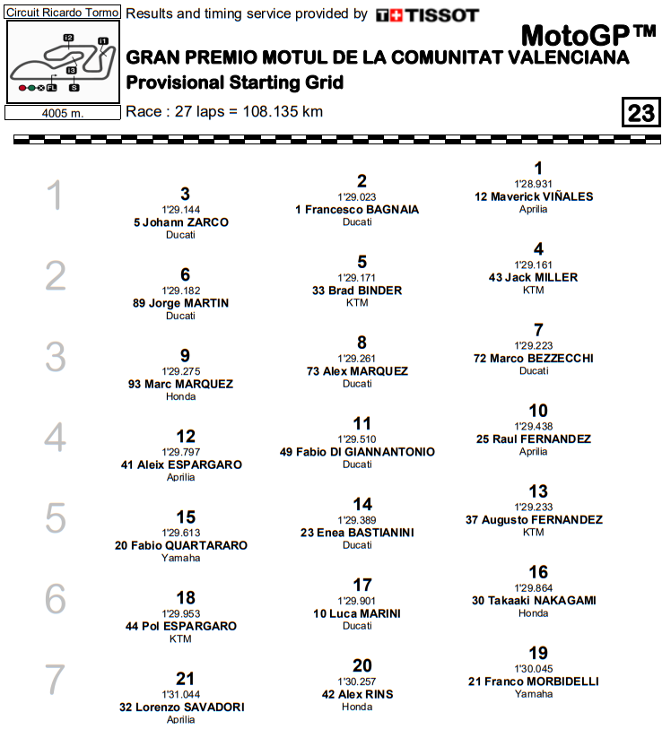 Terza fila per Marco Bezzecchi, settimo davanti ai fratelli Marquez, con Alex, arrivato in Q2 col secondo tempo in Q1, e Marc che sono caduti nel finale provocando un paio di bandiere gialle. Nel complesso, Marc ha raccolto meno di quello che avrebbe potuto dato che ha passato tutta al Q2 della MotoGP in scia a Martin. Quarta fila per R. Fernandez, Di Giannatonio e A. Espargaro.