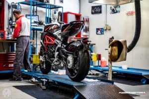 Le motociclette vengono quindi sottoposte una ad una alla verifica qualitativa finale, svolta da un tecnico che armato di chiave dinamometrica e calibro verifica che tutto sia come da progetto evitando che qualcosa sia stato lasciato al caso. Da qui le moto vengono parcheggiate nell’hangar, una volta verniciatura dell’Aermacchi, dove prendono le strade più disparate. Così si conclude il processo produttivo delle MV, semplice ma mai banale e che permetterebbe la realizzazione di 8000 moto all’anno pur mantenendo una elevata cura artigianale, anche se la volontà è quella di tenersi attorno alle 5000 unità. Da segnalare che, con l’introduzione delle versioni Euro IV, tutte le MV Agusta vengono offerte con 36 mesi di garanzia e 3 anni di manutenzione programmata inclusi nel prezzo.