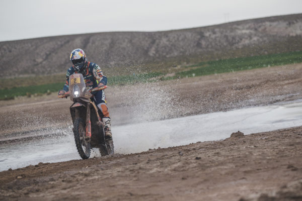 Il pilota francese, tra l’altro, era stato uno dei pochi ad uscire indenne dal dedalo di canyon che tanti minuti è costato ad altri protagonisti della corsa. Gli apripista delle due ruote infatti, a causa di un roadbook poco chiaro, hanno sbagliato completamente il punto in cui uscire da uno degli alvei in secca che costellavano la parte finale della Speciale e si sono ritrovati totalmente fuori strada. Il loro stesso errore è stato poi commesso da tutti i piloti che si sono fidati delle loro tracce, e tra questi ci sono nomi illustrissimi: Barreda, Price, Meo…tutti sono finiti ben lontani dal percorso dovendo quindi perdere parecchio tempo per tornare sul tracciato, e questo si è tradotto in una enorme possibilità di fuga per quei – pochi – piloti che invece sono riusciti a trovare subito la strada giusta. Fra di loro spicca Matthias Walkner, che con la sua KTM ha approfittato degli errori altrui non solo per vincere la tappa completando il percorso cronometrato in 4:52’26”, ma anche per prendersi la vetta della classifica generale nella quale, visto il vuoto lasciato da Van Beveren, ora domina con ben 39’42” di vantaggio su Joan Barreda.