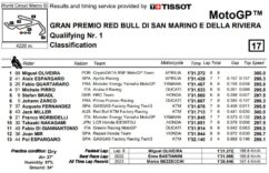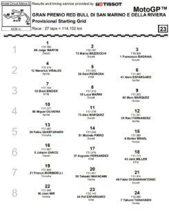 Terza fila per Binder, con Marini e Marc Marquez. Quarta per Oliveira, arrivato in Q2 grazie al miglior tempo in Q1, che avrà come compagni di partenza Alex Marquez, molto sotto tono, e il compagno di squadra Raul Fernandez, che da quand’è in MotoGP riesce a mettersi in luce solo a Misano.