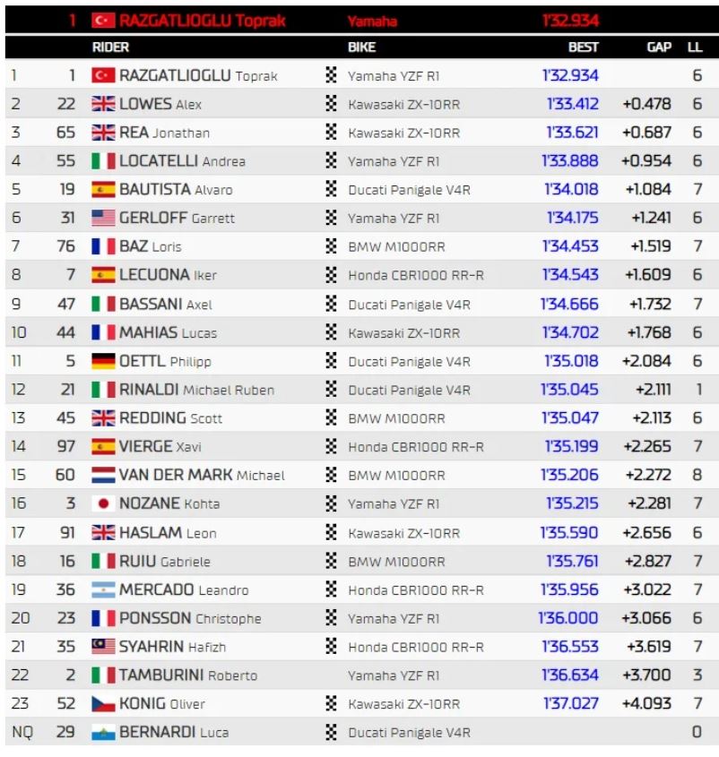 Il primato del turco ha retto a lungo, finché a pochi secondi dal termine è stato proprio lui a migliorarlo con un giro pazzo. Razgatlioglu ha firmato uno stratosferico 1’32’’934, meritandosi appieno la Superpole arrivando a un secondo dalla Pole di Vinales in MotoGP nel 2021. Secondo tempo per Alex Lowes, a quasi mezzo secondo dal #1, che rifila due decimi al caposquadra Rea: i due alfieri di Kawasaki completeranno la prima fila in gara-1 e Superpole Race.