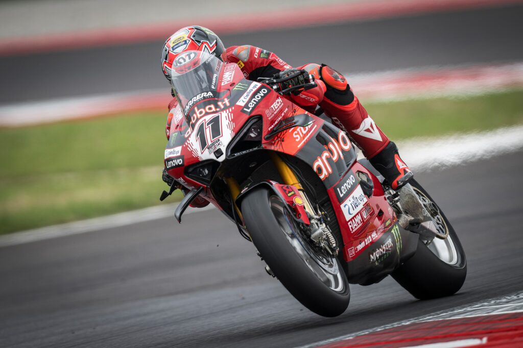 Addentrandosi in un’analisi più tecnica e dettagliata del venerdì di prove, Bulega ammette di non aver trovato ancora il setup perfetto della sua Panigale V4R. Inoltre, il #11 spiega il motivo per cui il discusso nuovo forcellone non è stato testato in questa giornata: “Ho provato entrambe le gomme posteriori, ma non ho sentito tutta questa differenza: oggi il feeling con la moto non era ottimo, non sono riuscito a spingere come avrei voluto ed è per questo che non ho trovato grandi differenze tra la SCX standard e la soluzione di sviluppo. Non abbiamo avuto occasione di provare il nuovo forcellone: durante un weekend di gara è veramente complicato testare nuove componenti, in più stamattina nelle FP1 con la pista bagnata non abbiamo girato: non possiamo permetterci di perdere ulteriore tempo per provare il forcellone”.