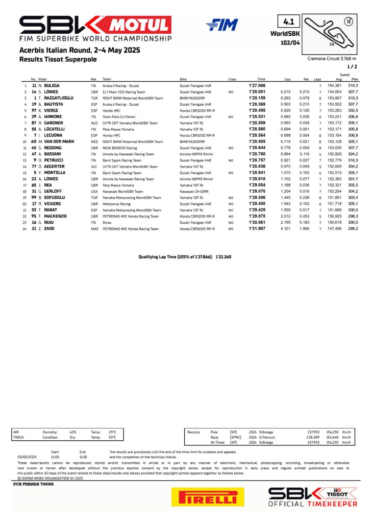 Ancora una volta è Niccolò Bulega a prendersi il comando delle operazioni sul circuito di Cremona: il leader della classifica iridata fa segnare il record della pista e conclude la Superpole al primo posto, aprendo la prima fila davanti ad un sorprendente Sam Lowes e a Toprak Razgatlioglu, che mette una pezza sui problemi della BMW siglando il terzo miglior tempo. Quarta casella di partenza per Alvaro Bautista, mentre si prospetta una Gara 1 in salita per Danilo Petrucci, tredicesimo in griglia
