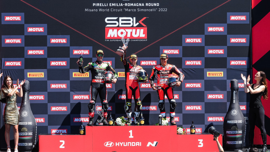 Il padrone di casa Michael Rinaldi è super soddisfatto per il primo podio della stagione ed è stato anche il più loquace nell’analizzare la “sua” Misano: “Sono contento, attualmente guardo solo a me e la gara è stata incredibile. Ho fatto fatica all’inizio ma il passo è stato davvero buono: sono stato per tutta la gara negli stessi due decimi e ho fatto il mio giro più veloce a fine gara. Ho lavorato tanto con il team su questo, quindi il terzo posto di oggi dopo una gara così è una vittoria per noi. Alvaro è veramente veloce e io sarei veramente stupido a pensare di poter stare con lui domani, intanto guardo a me e posso dire che passo dopo passo possiamo chiudere il gap. Oggi sono stato fortunato per il problema che ha avuto Toprak ma il nostro passo è stato davvero buono, quindi sono molto felice. Ieri hai detto che per stare coi primi tre devi essere al 100%. Senti di essere stato al 100% oggi o no? No, non ancora. Loro sono davvero forti in ogni momento della gara mentre io faccio fatica all’inizio e posso migliorare ancora a metà e alla fine. Continua a mancare qualcosa ma quando arrivi da momenti difficili è normale. Ora cerco di migliorare ad ogni gara. Rispetto allo scorso anno il livello si è alzato, siamo migliorati tutti. Cosa mi manca per stare con gli altri? Prendo come riferimento Alvaro perché posso vedere i suoi dati. Lui sfrutta tanto l’anteriore a metà curva ma ha uno stile un po’ diverso dal mio e non posso copiarlo perché, se ci provassi, perderei tempo. Mi muovo in maniera diversa ma secondo me, continuando così, in due-tre gare posso raggiungere Alvaro e stare con lui in gara. Dopo un inizio di stagione col freno a mano tirato, che valore ha questo podio?