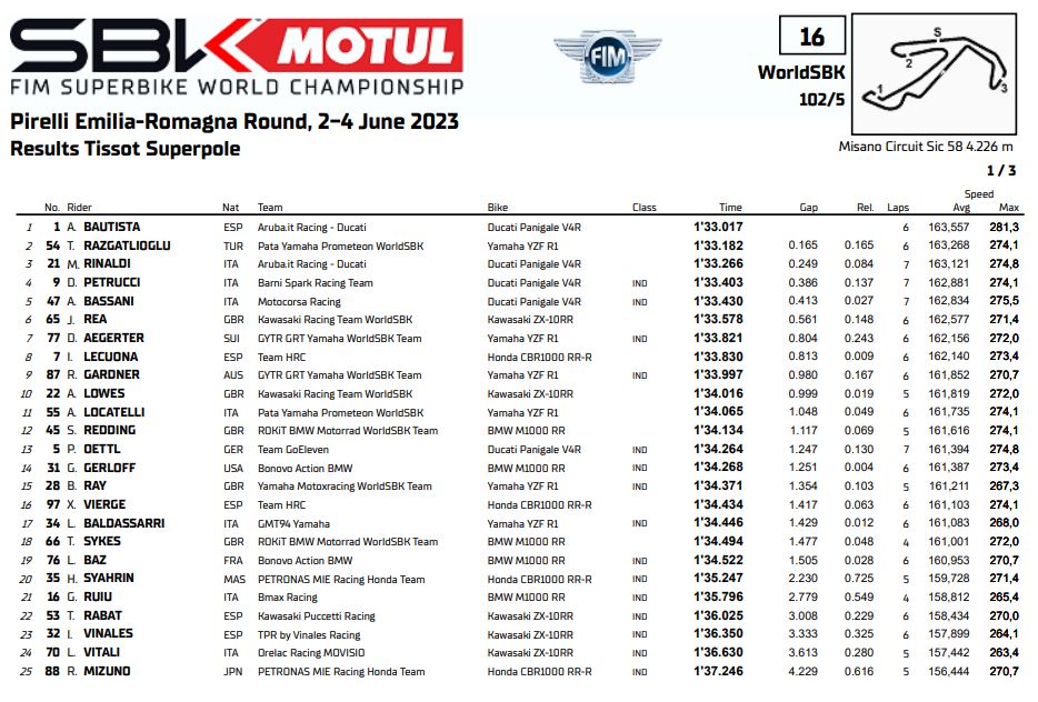 A rompere il motore è stato il povero Gabriele Ruiu, in sella all’inaffidabile BMW del team Bmax. Naturale la bandiera rossa, che ha comportato il termine per tutti della sessione con 1’45” di anticipo. Alla fine il miglior temp a referto è stato quello di Alvaro Bautista, che così conquista la Superpole dell’Emilia Romagna Round grazie ad un 1’33”017 firmato all’inizio del secondo run, prima della caduta. Tre decimi sotto il record che già gli apparteneva. Secondo tempo per Toprak Razgatlioglu, a meno di due decimi dallo spagnolo, che non è riuscito a migliorarsi nel secondo Run per cause di forza maggior. Terzo Michael Rinaldi, che può recriminare per la sessione condizionata dalle bandiere nel finale, ma intanto oggi e domani a mezzodì potrà scattare dalla prima fila.
