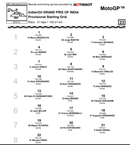 Il primo pilota rimasto escluso dalla Q2 è Fabio Di Giannantonio, il quale partirà davanti a Brad Binder e Takaaki Nakagami. Dietro di loro il neopapà Jack Miller, che non sta vivendo il suo miglior weekend, Franco Morbidelli fresco di contratto con Pramac e Augusto Fernandez. Penultima fila per Miguel Oliveira, Pol Espargaro e l’ormai veterano Stefan Bradl, questa volta presente non come wildcard ma come sostituto di Alex Rins. Chiude lo schieramento Michele Pirro, anche lui in veste di sostituto dell’infortunato Enea Bastianini che però a breve dovrebbe fare il suo ritorno in pista.