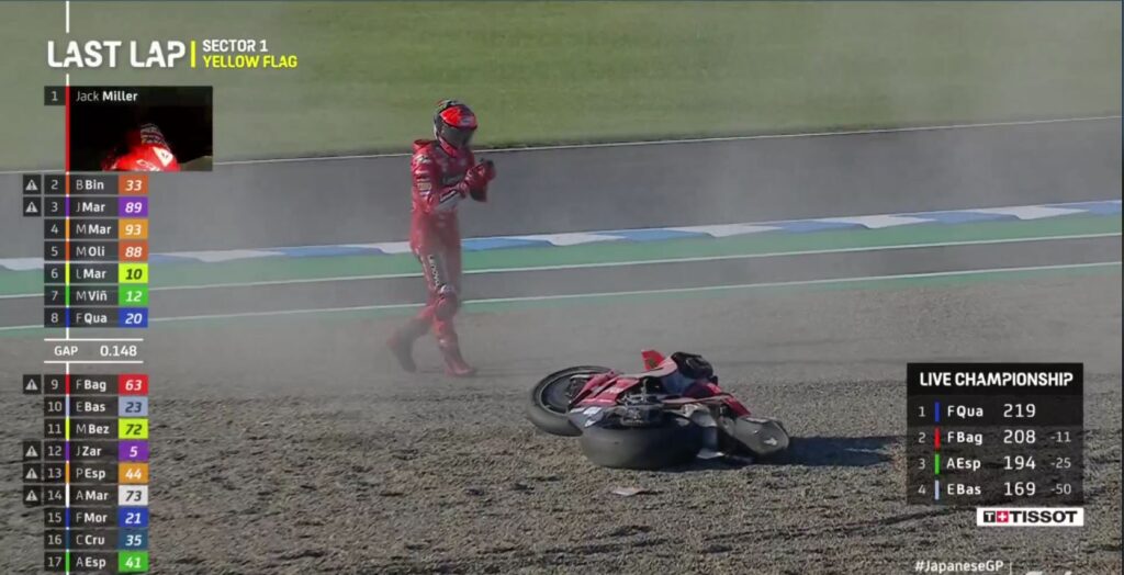 Parole dure quelle di Pecco Bagnaia verso sé stesso, autore di una rovinosa scivolata all’ultimo giro del GP del Giappone. Uno zero pesantissimo per la lotta mondiale, reso leggermente più leggero dalla sfortuna altrui.