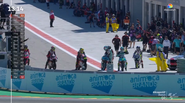 Impossibile fare peggio? Come no! Poco dopo c’è il secondo brutto episodio di oggi, ancora più grave. Esce regolarmente dal box di Sterilgarda Husqvarna Max Team il #71 Ayumu Sasaki, che fino ad ora si è tenuto fuori dai giochetti di scia. Ha una idea diversa il Tech3 KTM Team, che vuole posizionare il suo Adrian Fernandez #31 esattamente al gancio del giapponese del team di Biaggi. Timing scelto perfettamente, rovinato solo da un piccolo particolare: due meccanici di Sasaki tagliano la strada al pilota KTM, scontrandosi con lui e impedendogli di partire subito per inseguire l’avversario. Scena veramente indecente, una influenza esterna sul gioco di scie dei piloti non si era mai vista. Passino le finte in corsia box, divertenti ma tristi, però andare a impattare contro un ragazzino durante un campionato del mondo è qualcosa di veramente scandaloso. Il punto più basso della lotta per le scie, nonché una delle peggiori pagine del motomondiale dei tempi recenti. Andiamo a vedere il video dell’episodio, prima di un paio di considerazioni.