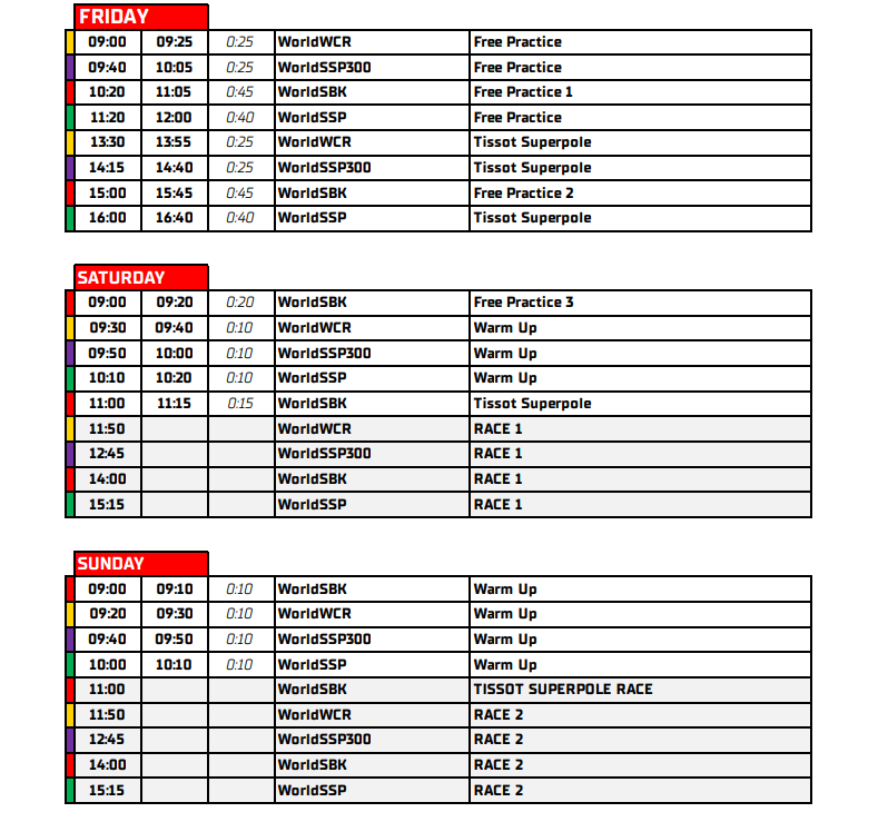 Di conseguenza, sono cambiati leggermente anche gli orari delle sessioni del weekend, che seguiranno la tabella sottostante, ma potranno avere variazioni ad ogni Round.