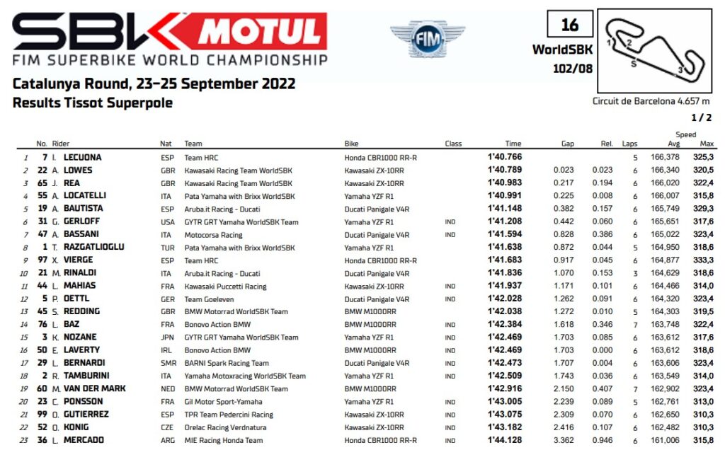 Locatelli può essere decisamente soddisfatto della sua quarta posizione, sia perché gli permetterà di partire davanti a Bautista, sia perché risulta essere la prima Yamaha sulla griglia. Insieme a loro in seconda fila c’è Garrett Gerloff, seguito da Axel Bassani, Toprak Razgatlioglu e Xavi Vierge. A chiudere la top ten troviamo Michael Rinaldi, autore di una caduta in curva 1 che gli ha compromesso la chance finale per una qualifica migliore.