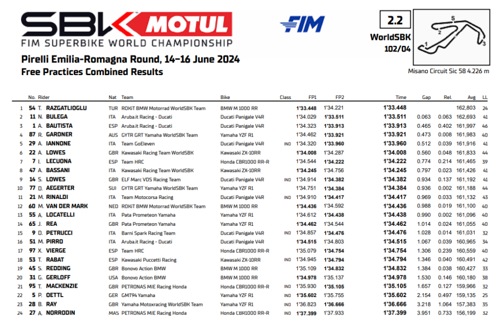 Pronti, partenza, via e il Round Emiliano-Romagnolo della Superbike ha visto subito Toprak Razgatliolgu davanti a tutti già dal mattino. Il suo crono di 1’33.448, infatti, si è rivelato essere non solo il migliore delle libere del mattino, ma il più veloce di tutta la giornata. Chi è migliorato nel pomeriggio è stato Nicolò Bulega, che a fine giornata ha chiuso a soli 63 millesimi dal tempo del turco. Ottimo terzo crono per Bautista, così come Gardner e Iannone, tutti sotto l’1’34. Sesta piazza per Alex Lowes, seguito da Lecuona, Bassani e dal suo gemello Sam Lowes. A chiudere la top ten delle libere di Misano è Dominic Aegerter sulla Yamaha del Team GRT.