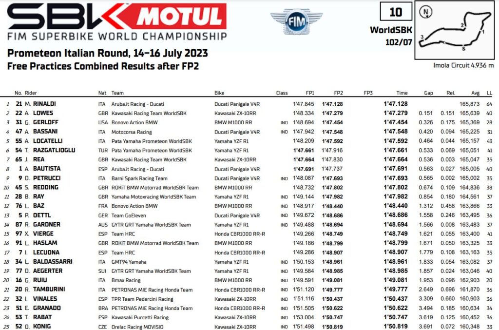 Quarto tempo per Bassani (+0”420) che chiude davanti ai connazionali Locatelli e Petrucci ma pure al capomarca Bautista. Dopo una sessione passata nelle retrovie, nel finale è spuntato pure Redding, autore dell’ottavo tempo finale, mentre Rea e Razgatlioglu completano la Top10 con tempi più alti rispetto al mattino. Dopo l’ottimo turno mattutino, Toprak e Jonathan sono sembrati in sofferenza durante queste FP2. Per il #54 e il #65 problemi soprattutto in frenata, forse per via dal gran caldo.