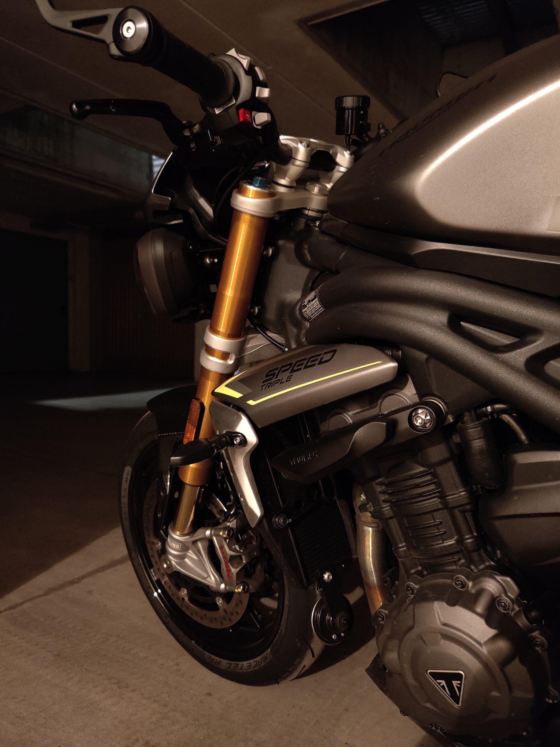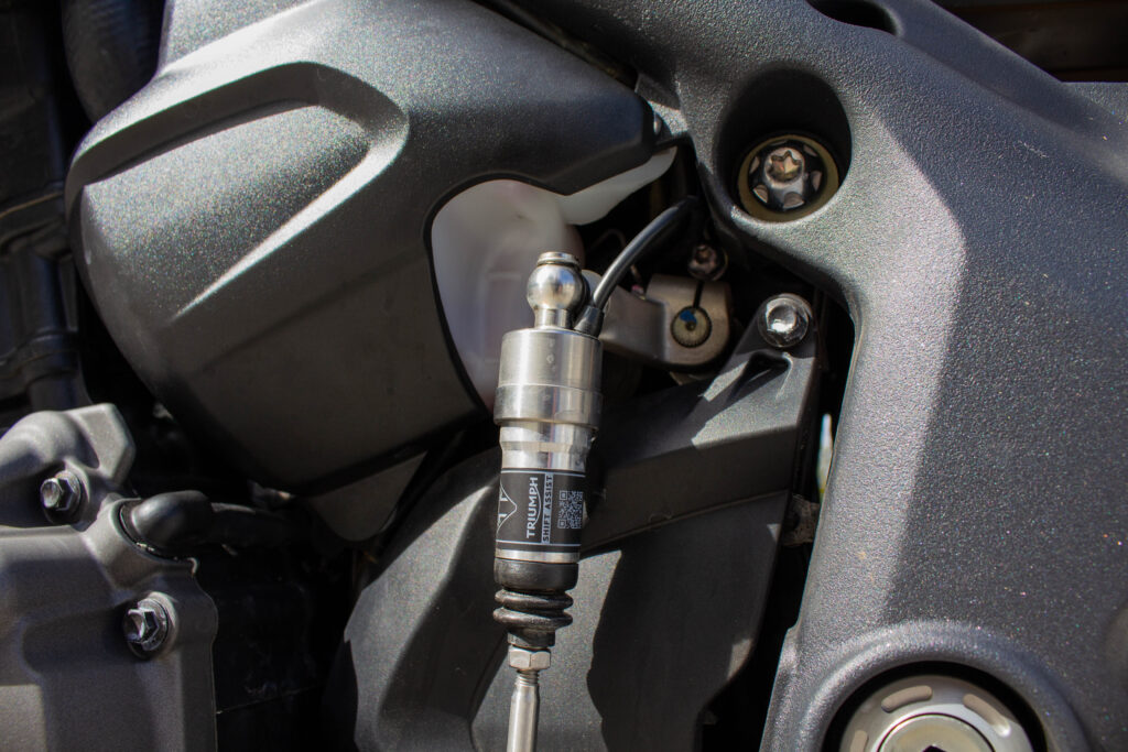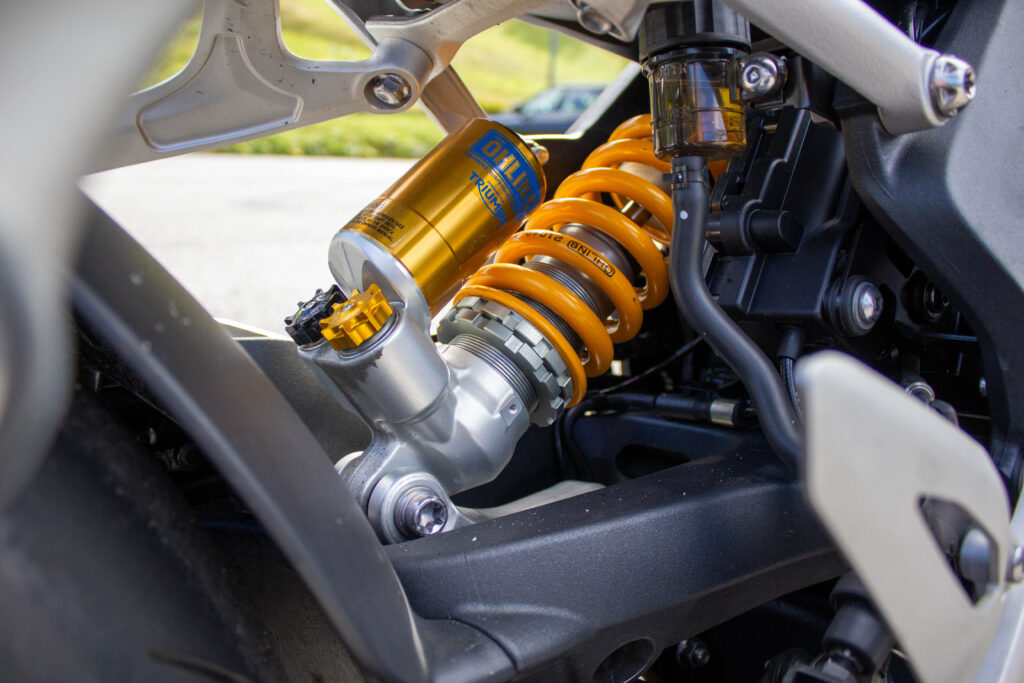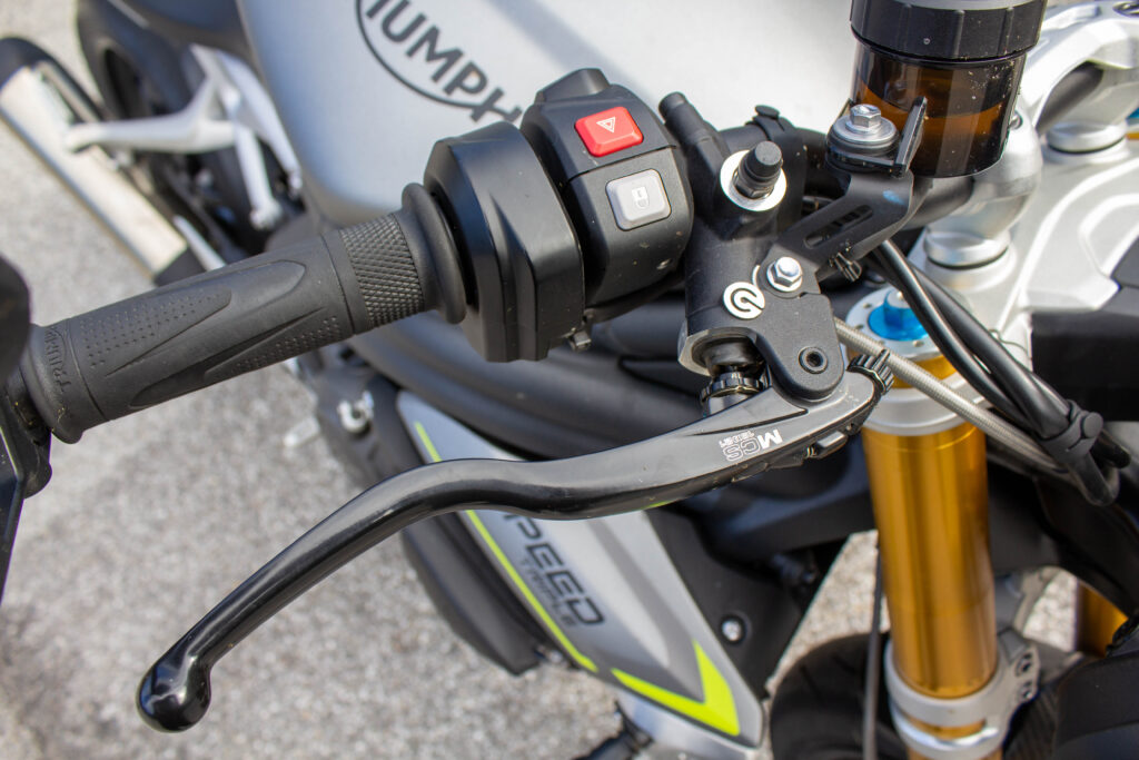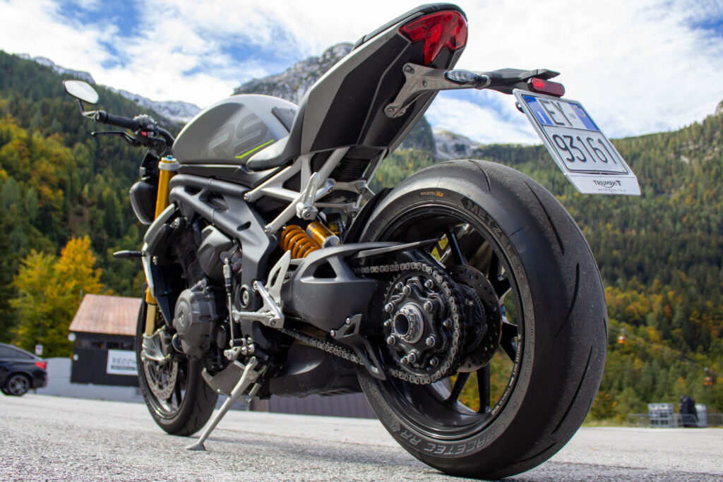Richiama il precedente modello, nella parte superiore, il telaio della Speed 1200. Del 17% più leggero, cambia significativamente nella zona inferiore, dov’è ben più corto e permette al motore (più compatto di prima nonostante cubatura e potenza) di essere collocato più in basso e in posizione più avanzata, dove viene spostato pure il baricentro. Si allunga invece il forcellone monobraccio, ma l’interasse rimane lo stesso della 2018-2020, 1445 mm. Leggeri i nuovi cerchi in lega di alluminio, che accolgono gomme Metzeler Racetec RR K3 in misure 120/70 e 190/55. Tutte Öhlins completamente regolabili le sospensioni, non elettroniche ma di altissimo livello: NIX30 all’anteriore con steli da 43 mm, TTX36 su specifica Triumph al posteriore, montato senza leveraggi. Sono Brembo Stylema, monoblocco radiali, le pinze freno anteriori, comandate dalla MCS regolabile nell’interasse (19-20-21), che mordono dischi da 320 mm. Sorpresa al posteriore, dove il disco da 220 mm è frenato da una pinza a due pistoncini. Un piccolo miracolo la efficacissima frenata e modularità del disco dietro, in un segmento di mercato che sotto questo punto di vista spesso delude. Probabilmente la scelta di Triumph è stata indirizzata anche dalla frenata combinata, visto che ora l’ABS può andare a frenare la ruota posteriore, cosa che accade sovente quando si frena decisi col davanti. Avrebbe potuto dare una sensazione strana, invece la centralina Continental MIB-EVO aiuta a far “sedere” un po’ la moto nelle staccate, modulando dinamicamente il suo intervento in base alla necessità e alla inclinazione della moto. Funzioni che non sapevi di volere e che ora desideri. Molto comoda la sella, appoggiata sul bel telaietto in alluminio. Inesistente il vano sottosella, non per modo di dire, letteralmente: cover monoposto e sellino passeggero, entrambi forniti di serie, vanno sganciati svitando una vite Torx con l’apposita chiave, fornita insieme a una brugola. Ma se non posso aprire la sella dove trovo gli attrezzi? Nella cover della vaschetta liquido refrigerante, che viene montata a incastro. Curioso. Sotto la sella principale, smontabile con un’altra vite, si trova la batteria al Litio. Altro dettaglio tecnico utile ad alleggerire la nuova Speed Triple.
