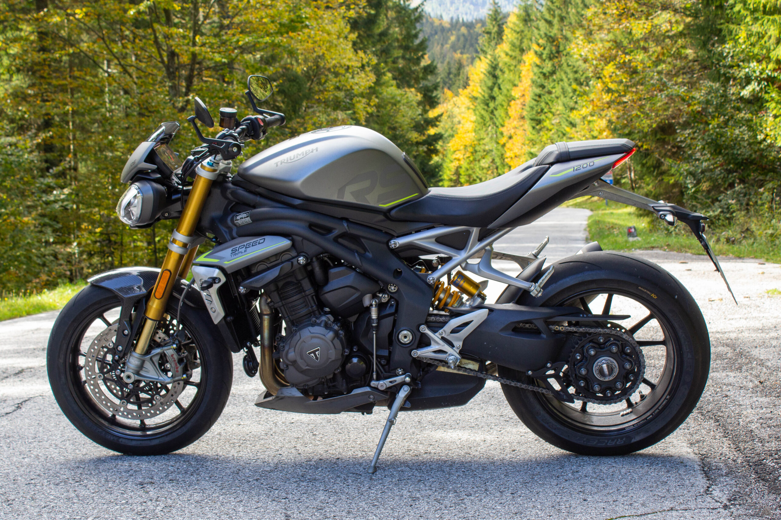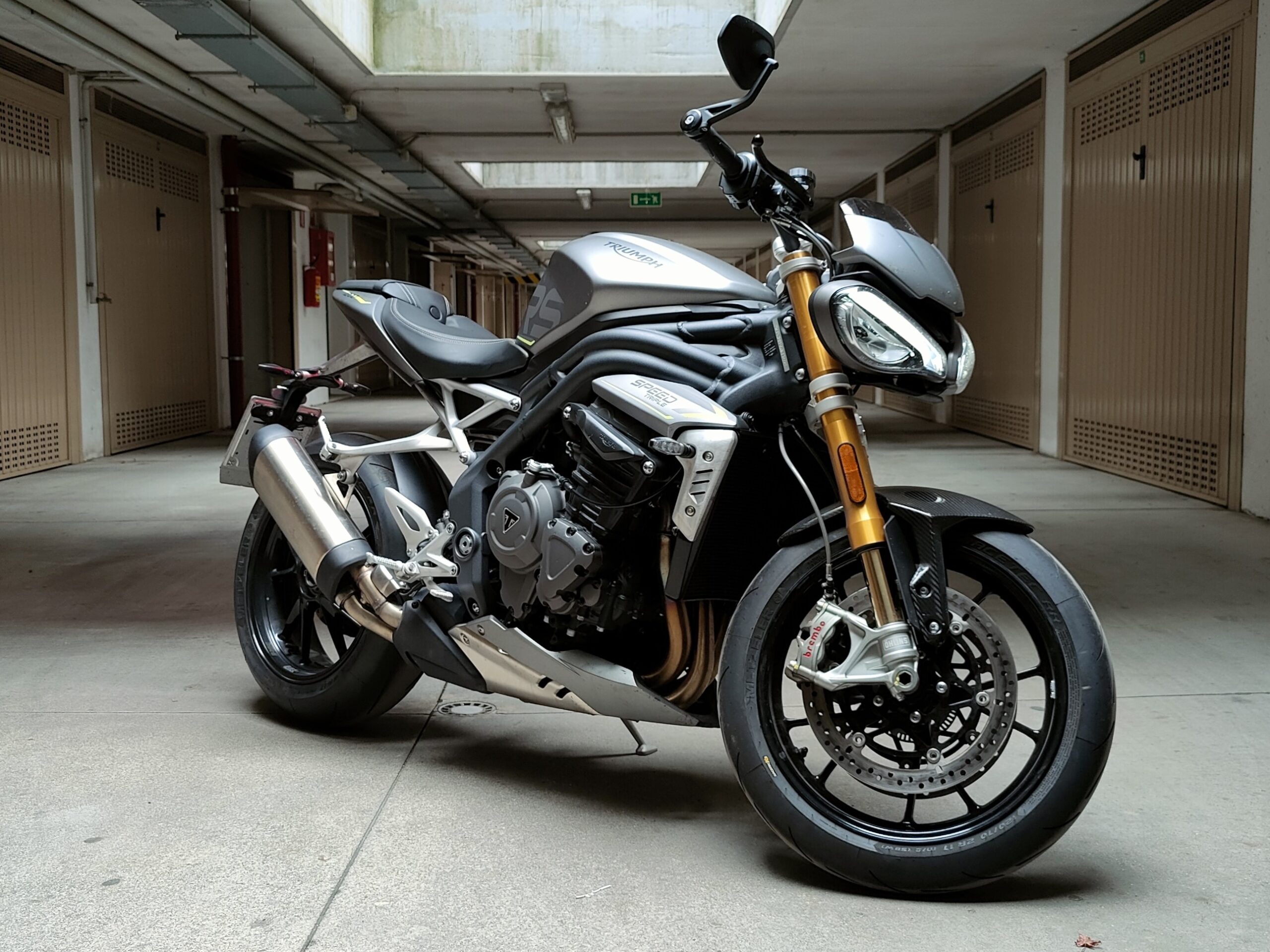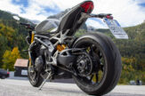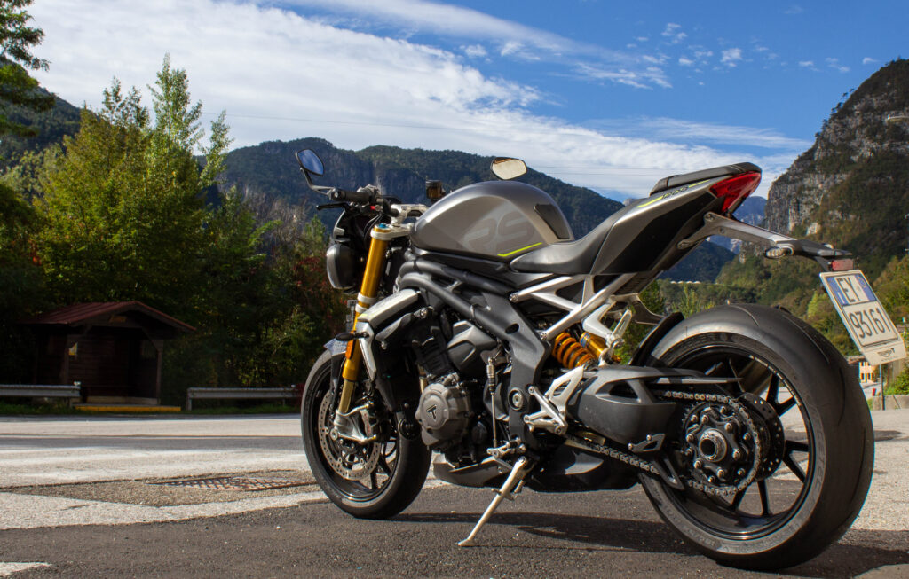 140 in prima, 170 in seconda, 200 in terza. Eh sì, km/h. 0-100 in ben meno di 4 secondi, se non si impenna troppo. E poi, decimo più, decimo meno, sono 8 secondi e mezzo per i 200 all’ora da fermo. Lo 0-250 sotto i 14″. Da zero a duecentocinquanta all’ora in meno di quattordici secondi. Potrebbe finire qua l’articolo. Ma sarebbe tremendamente limitato. Perché la parte davvero interessante è raccontare come questa moto faccia certe prestazioni spaventose, in quale modo si riesca a inserirla e portarla fuori dalle curve da piegata, di che ritmi e sicurezza riesca a mantenere nei tratti guidati. Iniziamo però da una considerazione: per sfruttare sempre, in ogni situazione, tutto il potenziale di questa moto sulle strade di tutti i giorni bisogna essere molto più stupidi che bravi. Va sempre tenuto acceso il cervello, perché la facilità con cui la Speed raggiunge certe velocità e le gestisce tra rettilinei e curve è qualcosa di mostruoso. Procediamo dunque con istinto di conservazione. Le pregiate sospensioni Öhlins sono molto sostenute ma non secche, anzi copiano egregiamente qualsiasi piccola o grande asperità del terreno, a qualsiasi ritmo e velocità non ci si sente mai “rimbalzare in giro”, ma sempre perfettamente in controllo. Sia la forcella che il mono sono completamente regolabili ed è inutile dire quanto fedelmente facciano sentire l’asfalto e rispondano a ogni piccola regolazione. Molto interessanti le pistaiole Metzeler Racetec RR K3, che con un profilo più tondo delle cugine Pirelli permettono di non guidare con la sensazione di essere sui trampoli, nonostante siano comunque gomme in mescola e dal disegno molto sportivo. Hanno comunque una carcassa più morbida delle italiane, derivata dalla ricerca di Metzeler nelle corse su strada (da qui il nome RR, road racing). Lavorano bene anche senza temperature estive, perfino sull’umido possono essere utilizzate senza eccessiva preoccupazione, certo con un minimo di attenzione. Probabilmente anche la combinazione di queste gomme con le sospensioni permette di avere una ciclistica rigida ma non esasperata, mentre per la guida in pista i tecnici inglesi hanno utilizzato anche le Supercorsa V3, che sono la alternativa consigliata per l’uso intensivo in tracciato. Eccezionale la frenata, le Brembo Stylema sono azionate dalla pompa MCS semi-radiale, che è regolabile, in base al mordente che si vuole applicare, in tre diverse posizioni di interasse, dalla 19 più delicata alla 21 più aggressiva. Verrà sempre leggermente frenata la ruota posteriore dalla centralina ABS, con la funzione combinata che permette di stabilizzare la moto e aiuta anche nella guida sportiva. È cornering il sistema antibloccaggio, dinamico in base alla inclinazione della moto, sembra non intervenire mai. Uno di quegli impianti che adori avere perché ti salverà solo quando, si spera mai, capiterà un’emergenza, senza mai nel frattempo disturbarti una sola volta nel tuo divertimento. Si può entrare molto decisi nelle curve, il telaio è possente e la grandiosa forcella anteriore sostiene perfettamente il peso di moto e pilota. Ridotto il trasferimento di carico, sia per il K elevato delle molle anteriori che per l’aiutino che il freno dietro dà tramite la frenata combinata.