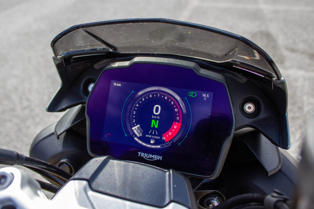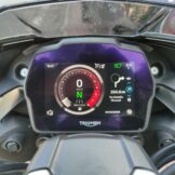 Sì lo so, fa un po’ ridere il titolo scritto così. Ma seriamente, questa bestia da 180 cavalli può sorprendervi nella sua facilità di guida. Certo, le curve restano il suo habitat prediletto, lo sappiamo, ma con l’inglesona ci puoi pure andare in giro, e mica solo per il breve spostamento verso i punti da piega! Complici le tante ottimizzazioni e le nuove funzioni è difficile descrivere questa moto solo come una banale maxi naked sportiva. L’ammirevole lavoro degli uomini di Hinckley ha creato la più facile e versatile Speed di sempre. Ma andiamo con ordine: la partenza. La frizione è abbastanza morbida, con una bella leva dalla regolazione micrometrica. La moto utilizza il sensore di consenso avviamento per verificare la posizione della leva e dare quindi un aiutino col gas, una sorta di assistente per la partenza, finché non si rilascia totalmente la frizione. Funzione da neopatentato tonto, certo, ma che con una prima marcia così lunga può aiutare a partire dal semaforo e non fare figuracce, soprattutto all’inizio. Ci si avvia con un godurioso gorgoglio dello scarico, sul quale è chiusa in questa fase la valvola parzializzatrice. È un supporto per rendere più rotondi i bassi e liberare tutta la potenza di fuoco quando si sale di giri. Il motore è leggermente ruvido sotto i 2000 giri, è meglio allungare leggermente in prima fino ai 30 all’ora e poi si può tranquillamente snocciolare tutte le marce a bassi giri con il cambio elettronico. Non velocissimo ovviamente a questi regimi, ma davvero davvero fluido. Una combinazione di regime di rotazione, apertura farfalla e posizione albero motore permette all’elettronica un timing perfetto per tagliare corrente e consentire l’inserimento della marcia, sia a salire che a scendere. Due modalità per le frecce a LED, tocco leggero per 3 lampeggi oppure pressione prolungata per il normale indicatore. Si può scegliere poi se utilizzare un’altra chicca, la impostazione di cancellazione automatica, che porterà allo spegnimento della freccia dopo 8 secondi più ulteriori 65 metri. Tecnologia LED anche per i fari, con le “sopracciglia” illuminate come posizione anteriore, mentre dietro c’è una striscia a forma di T a caratterizzare il codone. Anabbagliante il faro destro, col sinistro che si accende in aggiunta quando si va a richiamare l’abbagliante con il tasto raggiungibile con l’indice. Molto buona l’illuminazione, che consente di guidare in sicurezza anche di notte. La regolazione dell’altezza fascio luce è manuale.