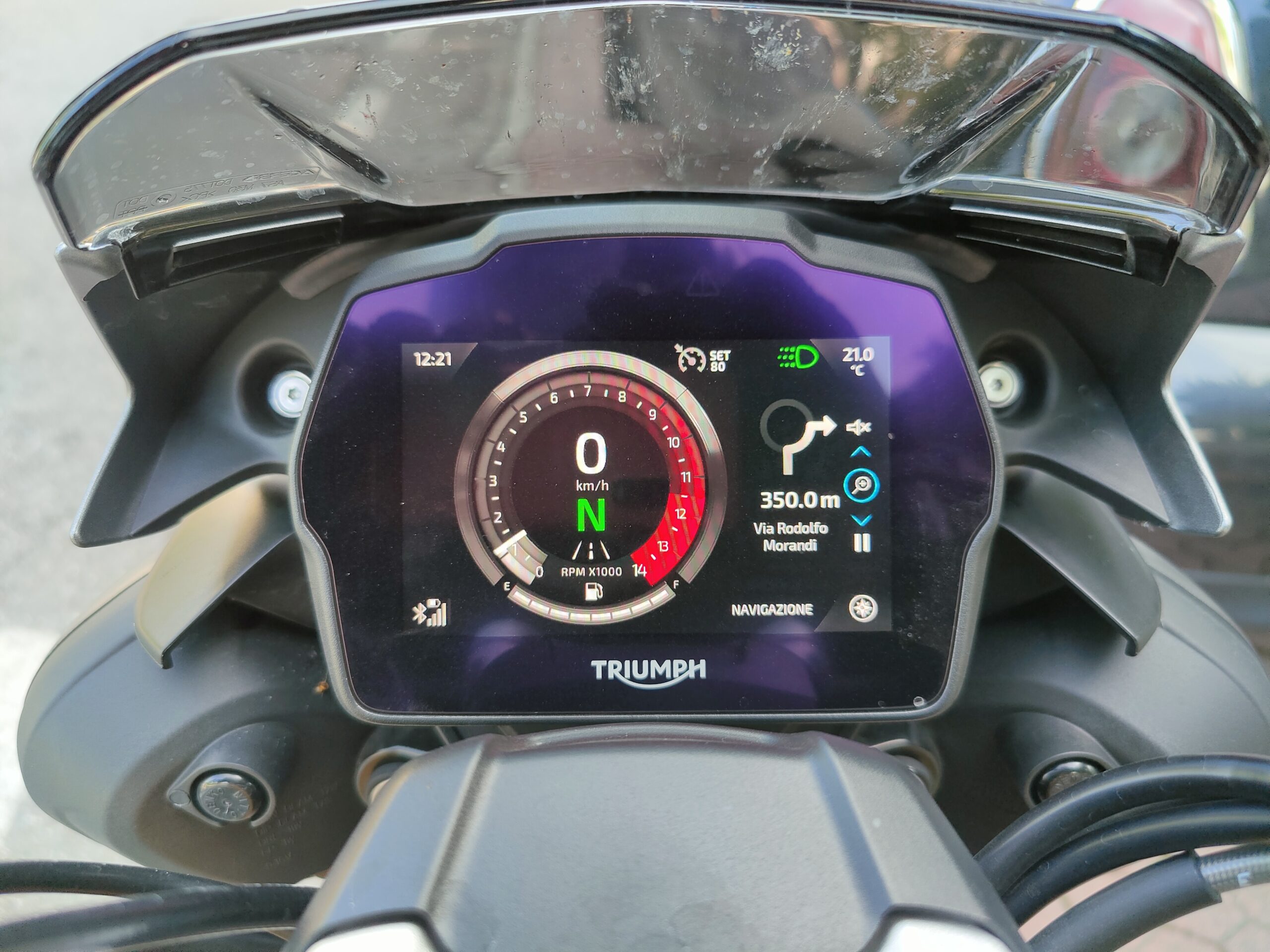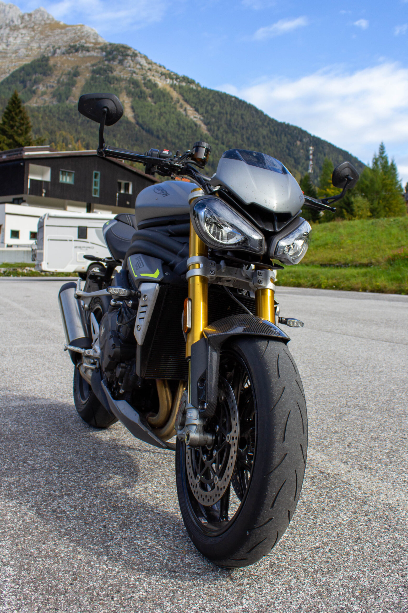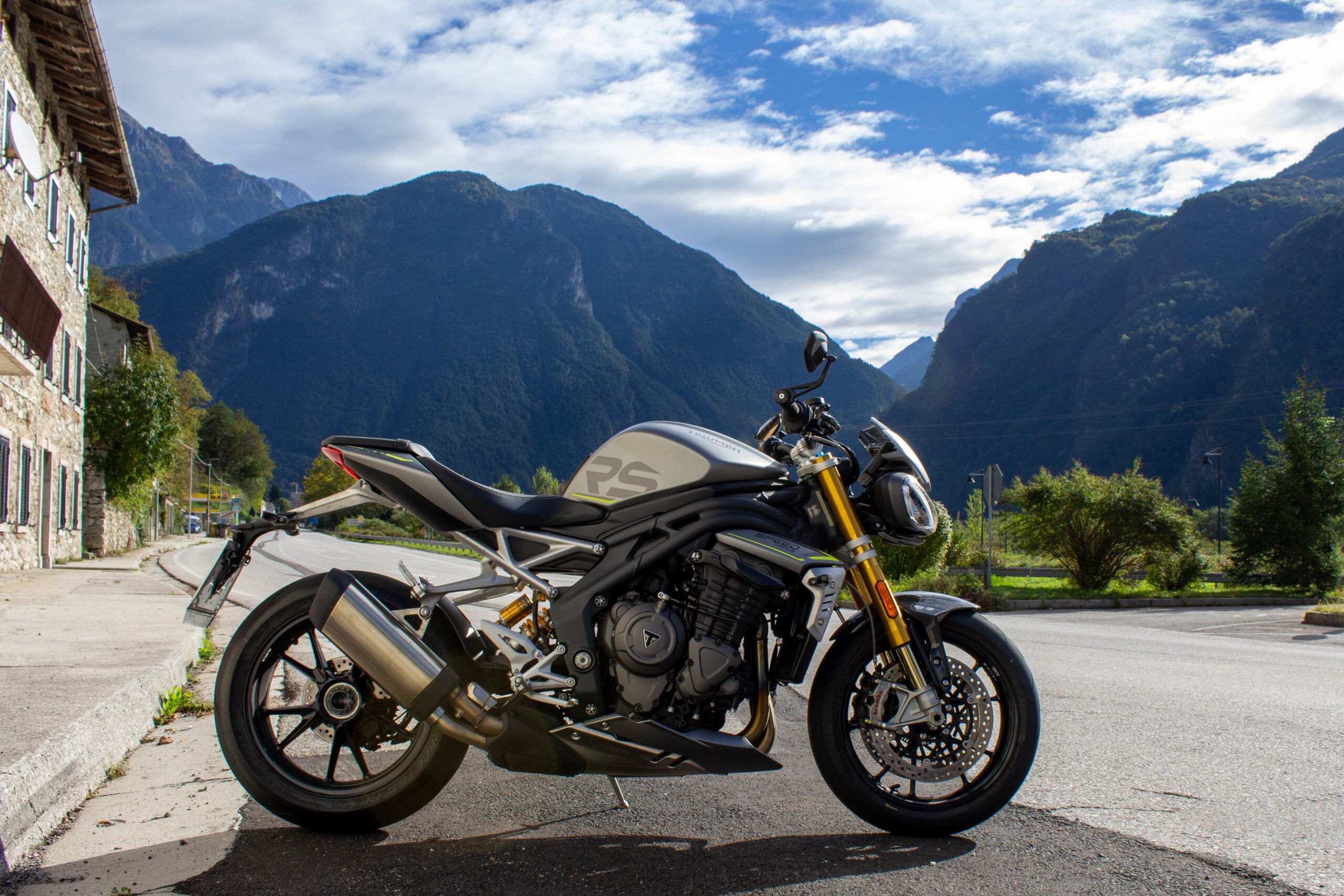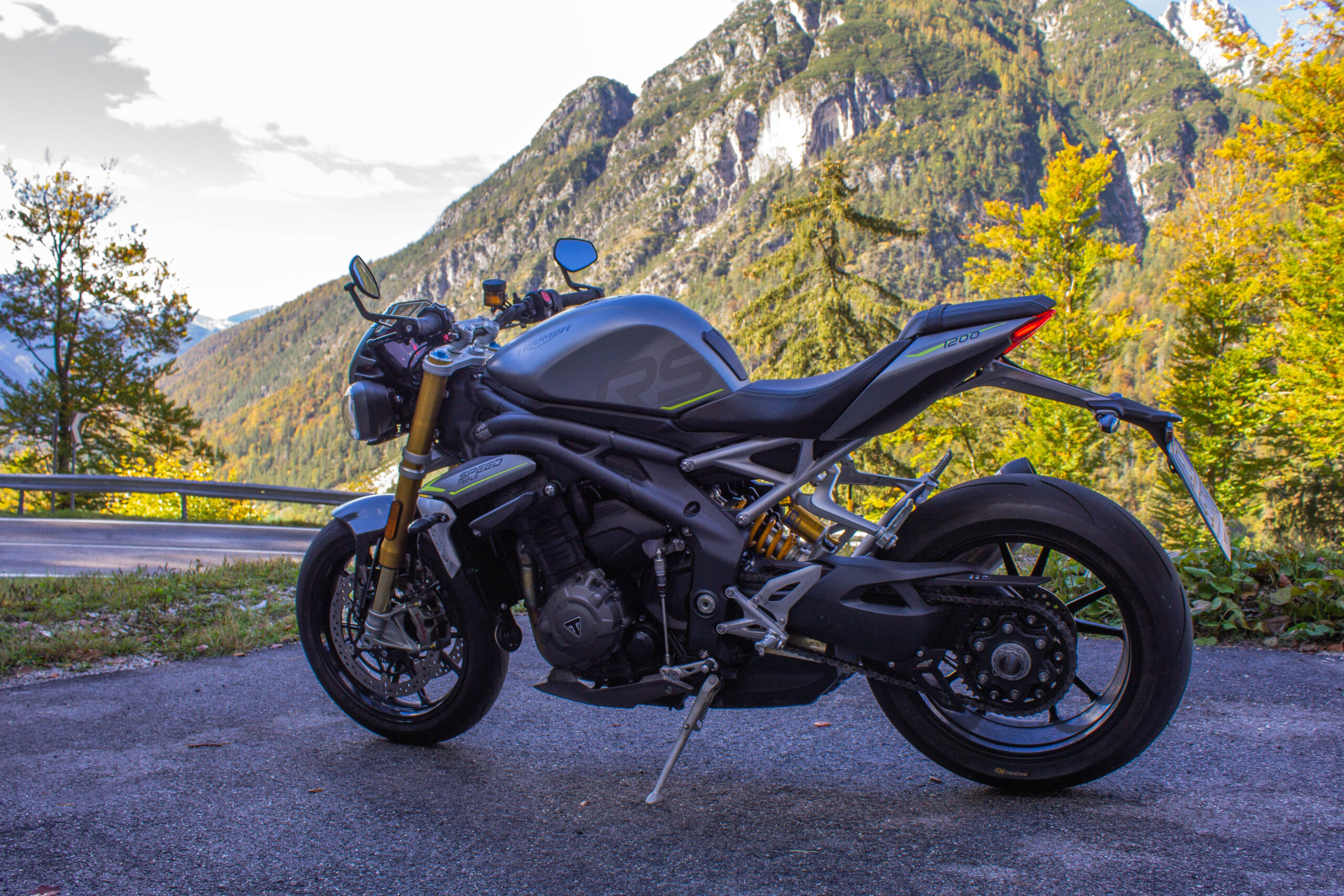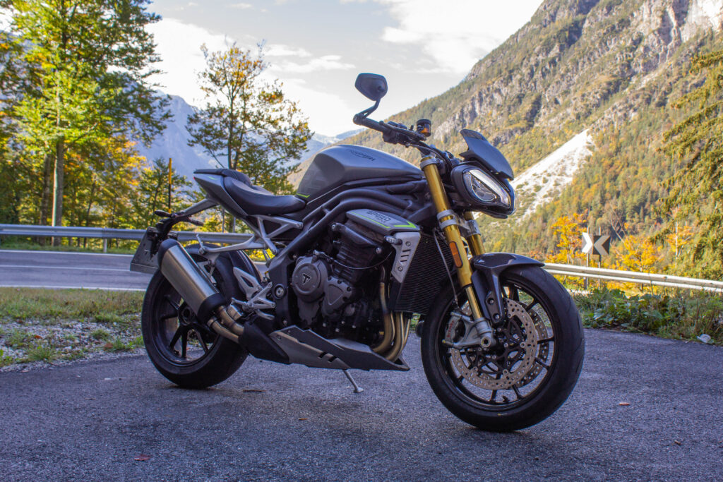 Comodi gli specchietti di serie posti alla fine del manubrio, permettono una ottima visibilità. La moto è facilmente controllabile anche in città, i 198 kg col pieno sono pochi per la categoria ma soprattutto sono posti in posizione bassa e avanzata, la Speed è compatta e infonde confidenza anche muovendosi nel traffico. Sella a 83 cm dal suolo, ben sfiancata sui lati, consente anche a persone non molto alte di avere un bell’appoggio a terra. L’unico vero difetto della 1200 in città è il calore che sale dal motore, veramente tanto. La ventola parte quasi subito, e non si ferma fino a quando non ci si inizia a muovere un po’. Il colpevole di queste temperature è sicuramente il grande catalizzatore nello scarico, ovviamente montato per colpa dell’Euro 5. Muovendosi in spazi aperti invece le temperature sono buone, anche se il motorone inglese scalda sempre un po’. Non è solo estetico il cupolino con vetrino fumé, optional, che devia una parte d’aria soprattutto dal corpo, mentre la testa rimane esposta a meno di incarenarsi completamente. Altri optional interessanti sono le manopole riscaldabili e i sensori TPMS (pressione ruote), che un’altra volta denotano la potenziale anima da touring leggero di questa maxi naked. Le funzioni elettroniche del TFT si completano con la connessione Bluetooth, a telefono e GoPro. Col cellulare, collegato allo schermo e al proprio interfono, si può rispondere alle chiamate ed effettuarle scegliendo i contatti dalla rubrica. È perfino possibile ascoltare musica con l’interfono e gestirla dal TFT, ma consiglio vivamente di godersi il sound del tre cilindri. La funzione più interessante è sicuramente la navigazione turn-by-turn. L’app My Triumph permette di impostare con Google Maps la meta del viaggio. Dopo aver collegato il telefono al Bluetooth della moto compariranno su un lato del TFT le indicazioni stradali, rappresentate da simboli di svolta e metri di distanza. Sistema che non può sostituire del tutto un vero e proprio navigatore, ma comunque comodissimo per non sbagliare strada, anche in zone totalmente sconosciute. Quando Triumph ci ha consegnato la moto ho guidato da Milano a Udine senza mancare una svolta. Infine con la connettività Bluetooth si può collegare la propria GoPro, per gestire inizio e fine registrazione delle clip tramite il joystick sul blocchetto sinistro. Molto utile il cruise control, che ho usato soprattutto per riposare la mano destra nei trasferimenti. Ho percorso anche molte centinaia di km al giorno durante questo test, con quasi un migliaio di km in un weekend come punta massima. Non solo percorsi di montagna e curvoni, ma appunto anche un po’ di città e tante provinciali. La posizione caricata ma non estrema della Speed si è rivelata perfetta per non affaticarsi anche nelle giornate più lunghe passate in sella. Ulteriore chicca la presa DIN sul lato destro della moto, permette sia di alimentare cellulari e accessori che collegare in entrata l’apposito mantenitore di carica per l’inverno. Ma è una Speed o una Tiger? Wow. La 1200 si è sempre comportata egregiamente nella vita di tutti i giorni, la tanta elettronica e le mille funzioni ti fanno guidare in serenità e sicurezza. Poi, quando la strada si apre, la Triumph mostra i denti. Affilatissimi.