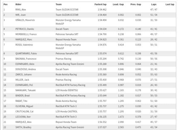 Rins ha chiuso davanti a tutti in 1’54″462, staccando di soli 2 millesimi Mir. I piloti della Casa di Hamamatsu hanno provato varie soluzioni di copriserbatoio, soprattutto Joan, per ottimizzare la posizione di guida e sfruttare al massimo il nuovo telaio. Per questi test Michelin ha deciso di portare le stesse coperture che verranno sfruttate nel prossimo GP, o quasi. Per l’anteriore infatti sono state portati due differenti pneumatici Hard, asimmetrici: da questi test si deciderà quale delle due soluzioni portare in gara per completare la rosa.