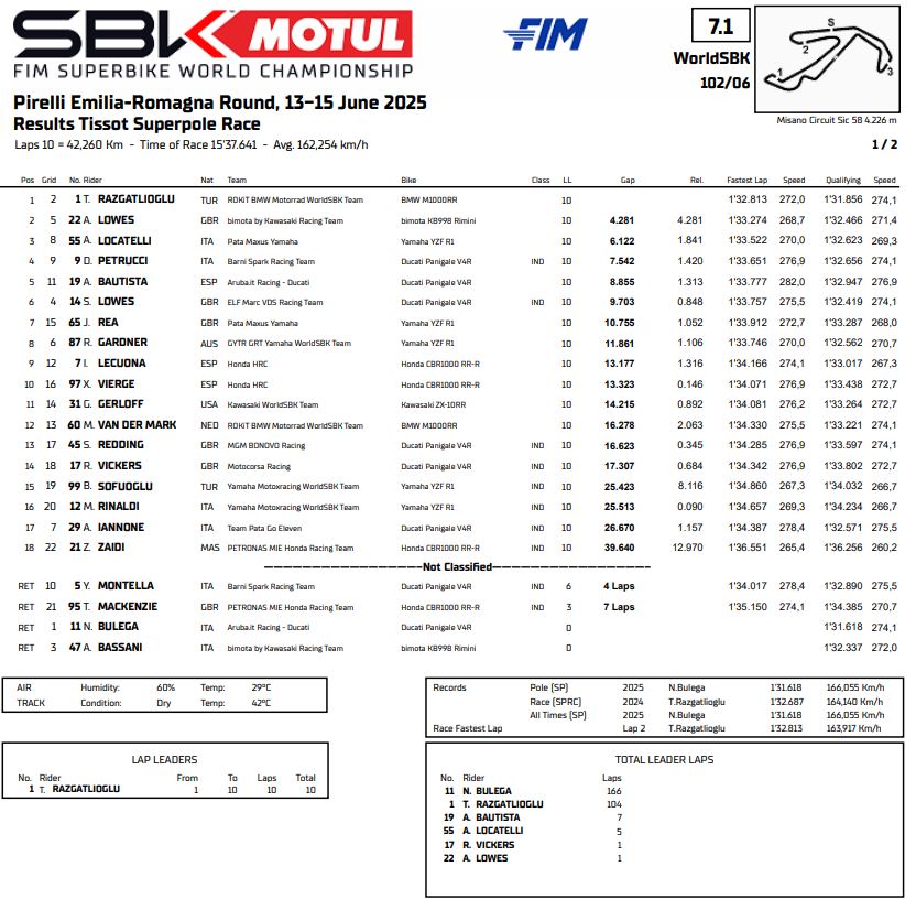 Vittoria comunque meritata per Razgatlioglu, che a Misano chiude con oltre 4 secondi di vantaggio su tutti gli altri nonostante la decisione di gareggiare con la SCX di sviluppo portata da Pirelli, mentre tutti gli altri hanno usato la più morbida SCQ di sviluppo che con oltre 41° sull’asfalto sembrava la soluzione migliore. Anche Bulega si era schierato con la SCX, ma purtroppo il confronto non c’è stato. Seconda posizione per Alex Lowes, che regala nella gara di casa il primo podio alla Bimota KB998 Rimini. Era da Phillip Island 2000, con il compianto Gobert, che la casa riminese non saliva sul podio. Terza posizione per Andrea Locatelli (+6″122), che ha tenuto la posizione per tutta la Superpole Race in sella alla yamaha ufficiale del team Pata.