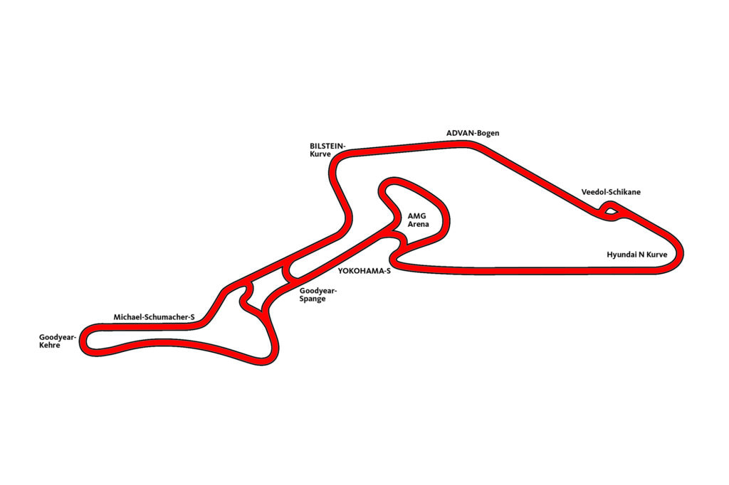 Sul rettilineo principale si raggiungono i 250km/h, si stacca profondo (all’inizio del cordolo esterno) per la frenata di curva 1 (Yokohama), un secco tonante verso destra da affrontare a circa 60km/h in 1a marcia. Questa è la prima e più grande opportunità di sorpasso. Qui si entra nella AMG Arena: tratto tecnico e lento del circuito. Segue una lunga curva cieca a sinistra da affrontare in 2a marcia a circa 115km/h. Importante ritardare il punto di corda e andare presto sul gas, sfruttando il più possibile il cordolo in uscita. Breve allungo e si gira nuovamente a sinistra per una curva molto secca da 1a marcia a 75km/h. Qui la frenata è complicata dal fatto che il volante non è mai dritto in approccio curva. Si “gira stretti a sinistra” per preparare al meglio il destra in uscita dalla AMG Arena. Qui è importante sfruttare tutto l’asfalto in uscita, così da costruire velocità verso curva 6. Curva 6 appunto: un veloce e tecnico curvone in discesa verso sinistra, da affrontare in 3a marcia a 145km/h dove la macchina tende ad andare in sovrasterzo in ingresso. Si mette dritto il volante e ci arriva subito in faccia curva 7, un destra in discesa da 2a marcia a 90km/h. Si cerca di vincere il sottosterzo e, sfruttando tutto il cordolo esterno, si accelera verso il tornante Goodyear. Si frena da 220km/h a circa 80km/h per la seconda opportunità di sorpasso. Curva molto tecnica, con un raggio stretto ma tanto banking. Queste caratteristiche permettono diverse linee e interpretazioni. Allungo verso la S in salita intitolata a Michael Schumacher. Due curve molto veloci da affrontare praticamente in pieno in 4a marcia (circa 180km/h per la prima). Qui è necessario essere a posto con il setup e in piena confidenza con la vettura. Allungo dove si toccano i 225km/h per poi frenare forte per curva 10, altra opportunità di sorpasso se si è usciti forte dalla S precedente. Sinistra secca da 3a marcia e 125km/h che ci prepara per il lungo destra (Blistein Kurve) da affrontare in progressione. Accelerare presto è fondamentale per raggiungere velocità importanti nel secondo, vero, rettilineo del tracciato dove si toccano i 250km/h. Si arriva così alla Veedol chicane: per questo evento viene usata la variante “veloce”: un sinistra-destra da 140km/h in 3a marcia, bellissimo e molto tecnico. Si arriva così a curva 16, la Hyundai N Kurve, un lungo destra da 85km/h in 2a marcia che collega l’uscita della S Veedol al rettilineo. L’ultima opportunità di sorpasso!