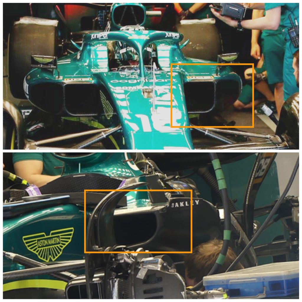 La rivoluzione più importante, come vi avevamo peraltro anticipato già qualche giorno fa è arrivata da Aston, che ha portato una vettura – sì, solo una – completamente rivista nei sidepods e nell’ala posteriore. Per ora abbiamo solo modo di vedere come il radiatore sia stato inclinato, mentre in precedenza giaceva in posizione orizzontale. Questo fa presagire un layout delle fiancate simile a Red Bull o alla prima versione della W13. Anche una nuova ala posteriore con un profilo piano sarà sulla vettura di Lance Stroll.