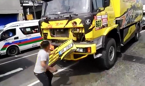 Alle volte, tuttavia, la passione si rivela tanto, forse troppo ardente. E’ questo ad esempio il caso di un tifoso peruviano che, approfittando del traffico congestionato della capitale peruviana, si è aggrappato ad un camion di assistenza del Big Shock Racing per farsi scattare una foto ricordo particolare del passaggio della Dakar tra le strade di Lima. Il tifoso infatti, sbilanciandosi in avanti con il proprio corpo, ha letteralmente divelto un pezzo del muso del camion, rischiando di cadere e ritrovandosi con parte della carrozzeria tra le mani.