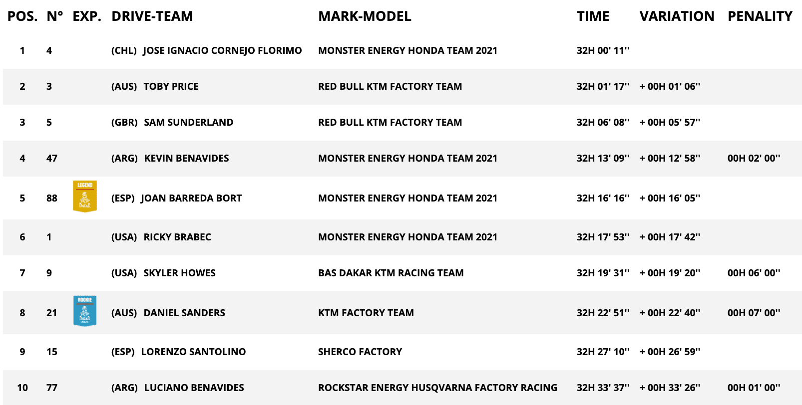 L’assenza del transalpino di Husqvarna modifica la graduatoria generale provvisoria, che ora vede davanti a tutti la Honda di Jose Ignacio Cornejo Florimo. Alle spalle dell’argentino resiste stoicamente Toby Price, 2° con 1’06” di ritardo, con Sam Sunderland che precede le Honda di Kevin Benavides e Joan Barreda. La classifica, a sole 4 Stage dal traguardo di Jeddah, resta comunque piuttosto corta: Ricky Brabec, 6°, è infatti distante poco più di 17′ dal crono complessivo di Cornejo Florimo, e dunque il vincitore della Dakar 2021 sembra ben lontano dall’essere individuato…