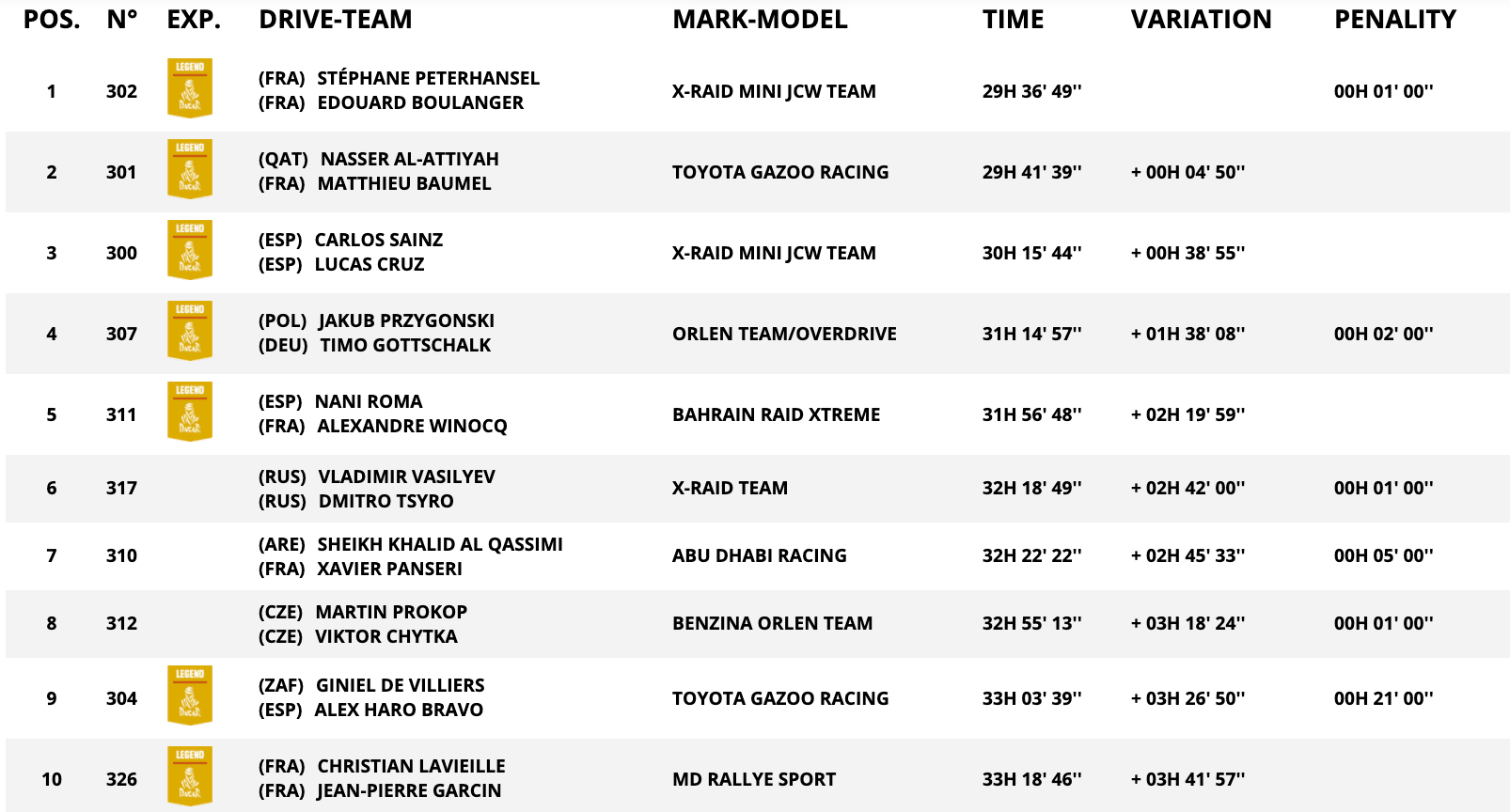 Ottima prova odierna poi per le due Peugeot 3008 DKR di Khalid Al Qassimi e Cyril Despres, rispettivamente 4° e 5° al traguardo, con le Hilux di Jakub Przygosnki e Shameer Variawa che occupano invece la 6^ e 7^ piazza di giornata. Ancora una volta in top ten è poi Vladimir Vasilyev, che precede Martin Prokop e il francese Christian Lavieille, 10° e capace di escludere dai primi dieci il buggy Hunter di Nani Roma. Ennesima Stage problematica invece per Sebastien Loeb, che sembrerebbe quasi essersi accollato tutti i problemi di gioventù del progetto Hunter: l’alsaziano risulta tuttora fermo tra il secondo e il terzo Waypoint, con un distacco dalla vetta che si preannuncia dunque monstre anche questa volta.