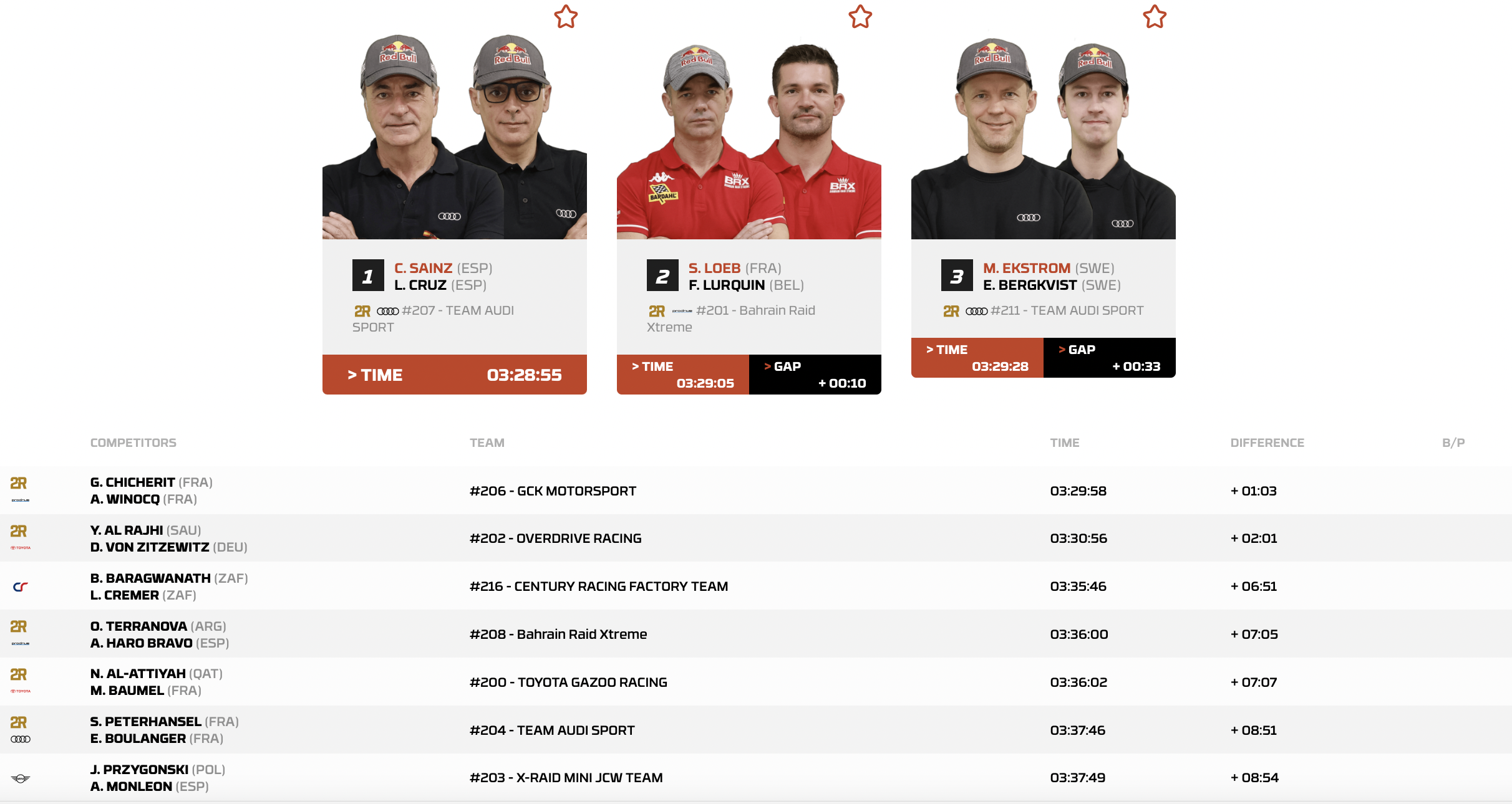 “El Matador”, grazie alla prestazione odierna, conquista anche la vetta della classifica assoluta. Alle sue spalle, staccato di 10”, c’è Sebastien Loeb, mentre Mattias Ekström scala al 3° posto con 33” di ritardo. 4° è Guerlain Chicherit, mentre due dei grandi favoriti, ovverosia Nasser Al-Attiyah e Stephane Peterhansel, pagano un gap dalla vetta di 7’07” e 8’51”.