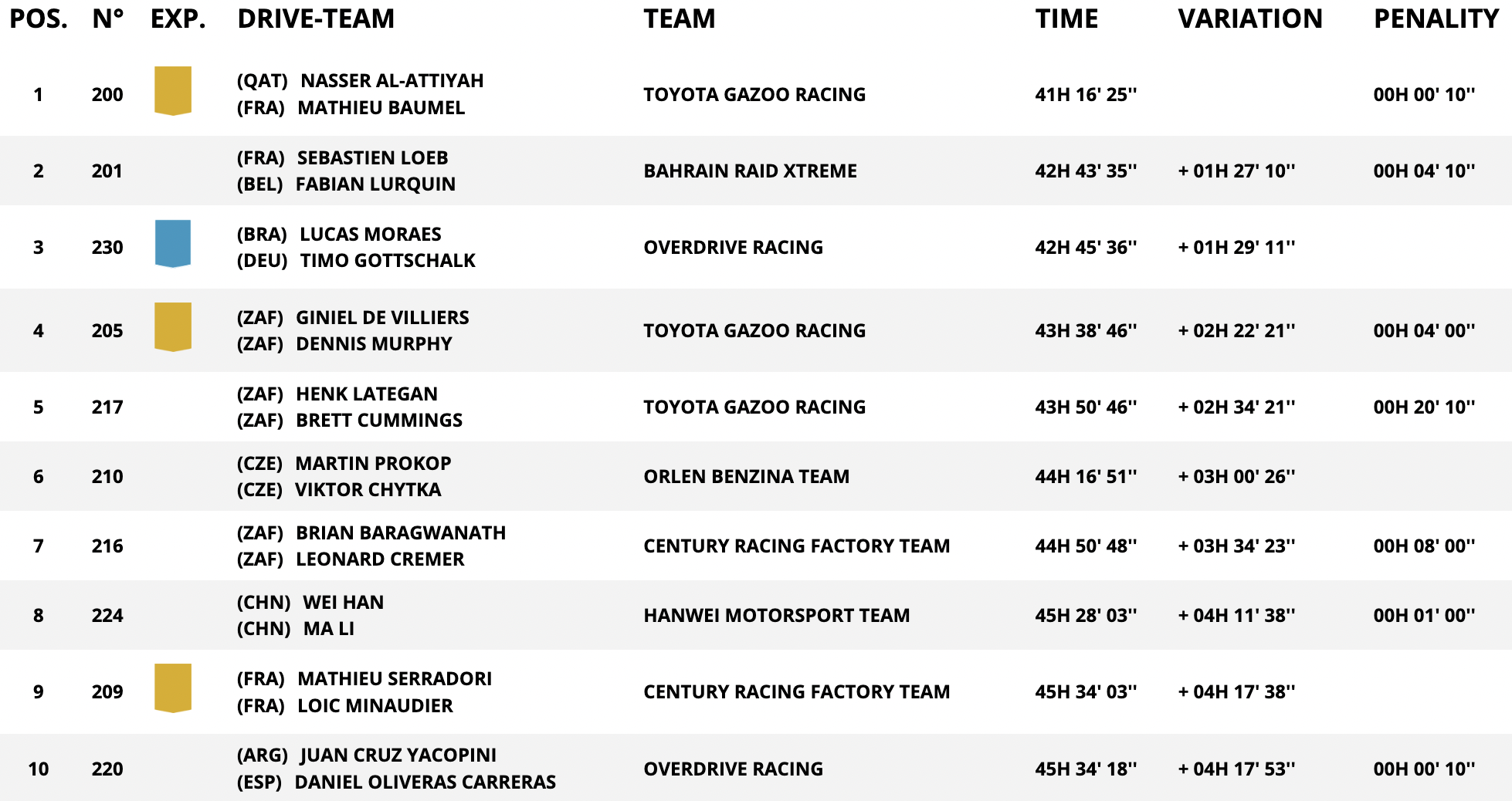 È arrivato 4° il sempre veloce Guerlain Chicherit, mentre Jakub Przygonski e Mathieu Serradori hanno preceduto Martin Prokop e Yazeed Al Rajhi, primo dei piloti ad accusare un gap superiore ai 10’ dal crono messo a segno da Loeb. 9ª posizione poi per Giniel de Villiers, mentre un po’ di terreno l’ha perso Lucas Moraes: il rookie brasiliano ha infatti chiuso 10° e staccato di 11’38” dalla vetta, venendo così costretto a scalare sul gradino più basso del podio nella classifica assoluta.