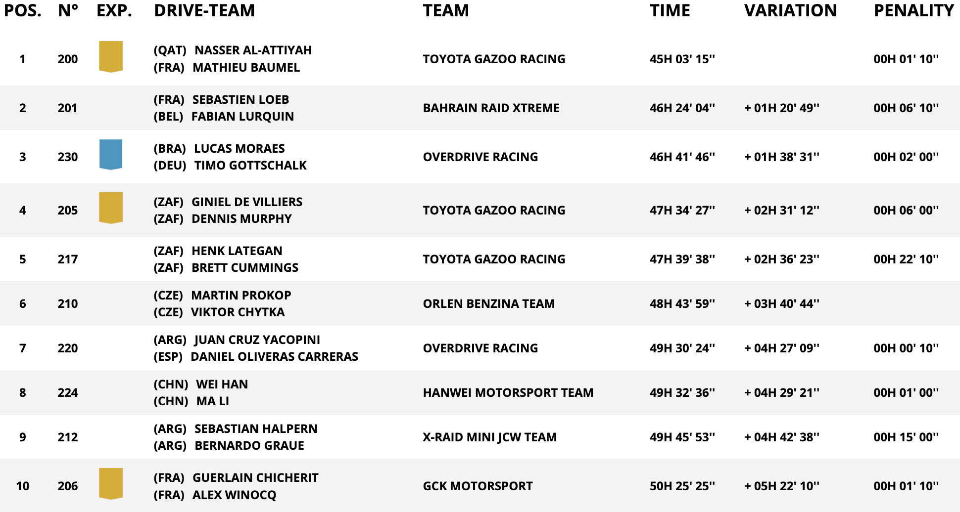 Ai piedi del podio di giornata è invece giunto Jakub Przygonski, inseguito da Henk Lategan e Sebastien Loeb: l’alsaziano, oggi 6°, ha visto così interrompersi un filotto di vittorie di tappa consecutive iniziato addirittura nella Stage 8. Alle spalle del nove volte campione del mondo del WRC si è messo Yazeed Al Rajhi, mentre non è andato oltre l’8ª posizione Nasser Al-Attiyah, vincitore assoluto della Dakar 2023: il qatariota, consapevole del mostruoso vantaggio in classifica, anche nella Stage 14 ha lasciato che fossero gli altri a sfogarsi mentre lui andava a centrare il suo quinto successo – il secondo consecutivo – alla Dakar. Alle spalle dell’alfiere di Gazoo Racing ha chiuso Giniel de Villiers, mentre nientepopodimeno che Carlos Checa ha provveduto a completare la top ten odierna. Fuori dai primi dieci invece Lucas Moraes, che tuttavia sono sicuro non darà troppo peso al risultato ottenuto nella Stage 14: il rookie brasiliano è stato infatti autore di un’ottima Dakar 2023, che l’ha visto concludere al 3° posto assoluto alle spalle di Al-Attiyah e Loeb e davanti a Lategan e de Villiers.