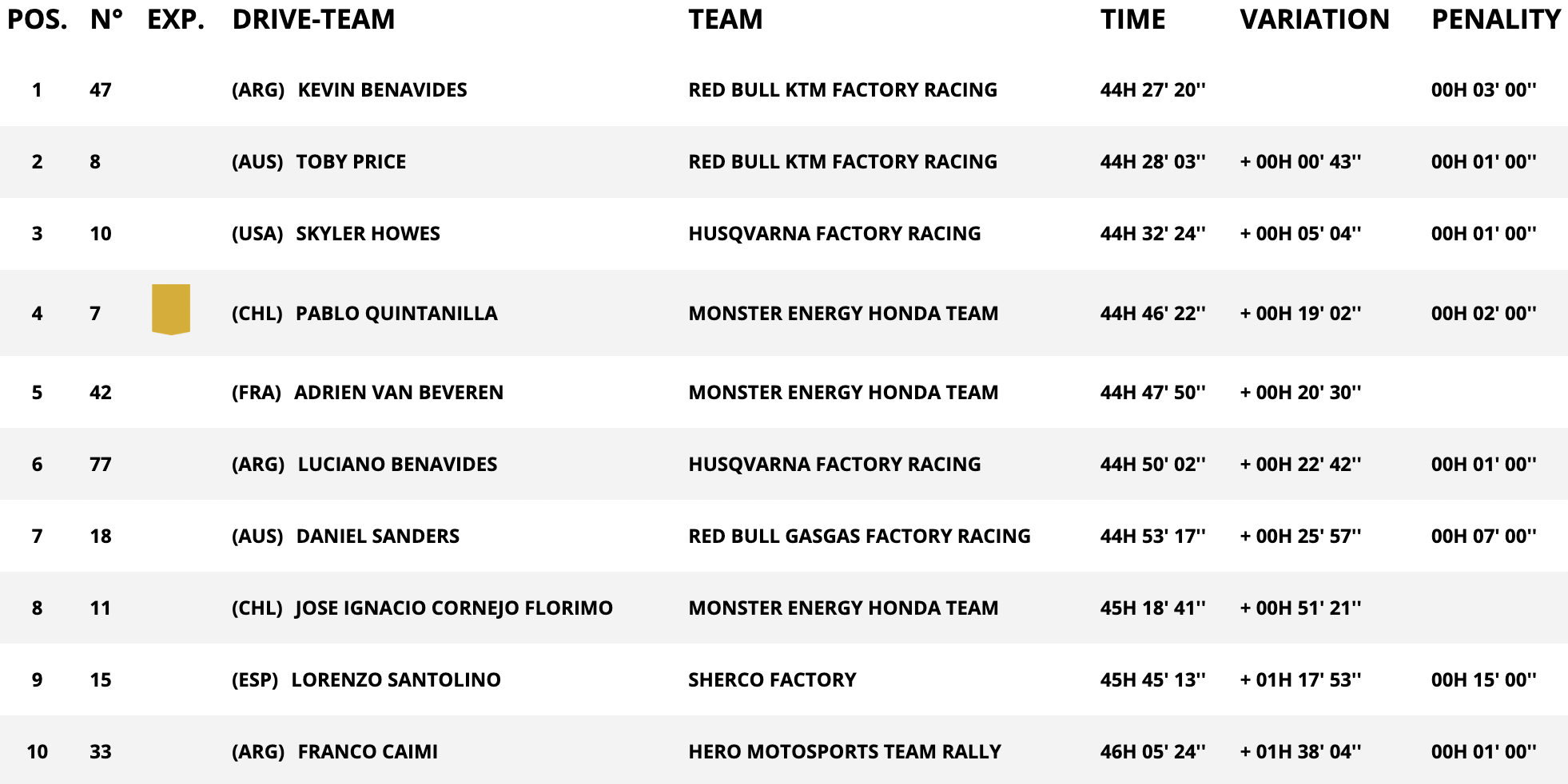 Dietro Benavides e Price – con la Casa di Mattighofen che torna dunque prepotentemente sul podio della Dakar dopo avere mancato per due anni consecutivi l’appuntamento con la vittoria – è giunto quest’oggi Pablo Quintanilla, mentre Daniel Sanders si è preso la 4ª posizione davanti a Skyler Howes: lo statunitense dell’Husqvarna le ha davvero provate tutte per rompere le uova nel paniere di KTM, ma il ritmo mostrato da Benavides e Price nelle ultimissime giornate è stato eccessivo anche per lui e lo ha costretto dunque ad accontentarsi della 3ª piazza assoluta. 6° nella Stage 14 è poi giunto Sebastian Bühler, che sul traguardo di Dammam ha preceduto Luciano Benavides, Adrien Van Beveren (che nella classifica generale si è piazzato 5°, alle spalle anche di Quintanilla) e Tosha Schareina, 9° davanti a Stefan Svitko.