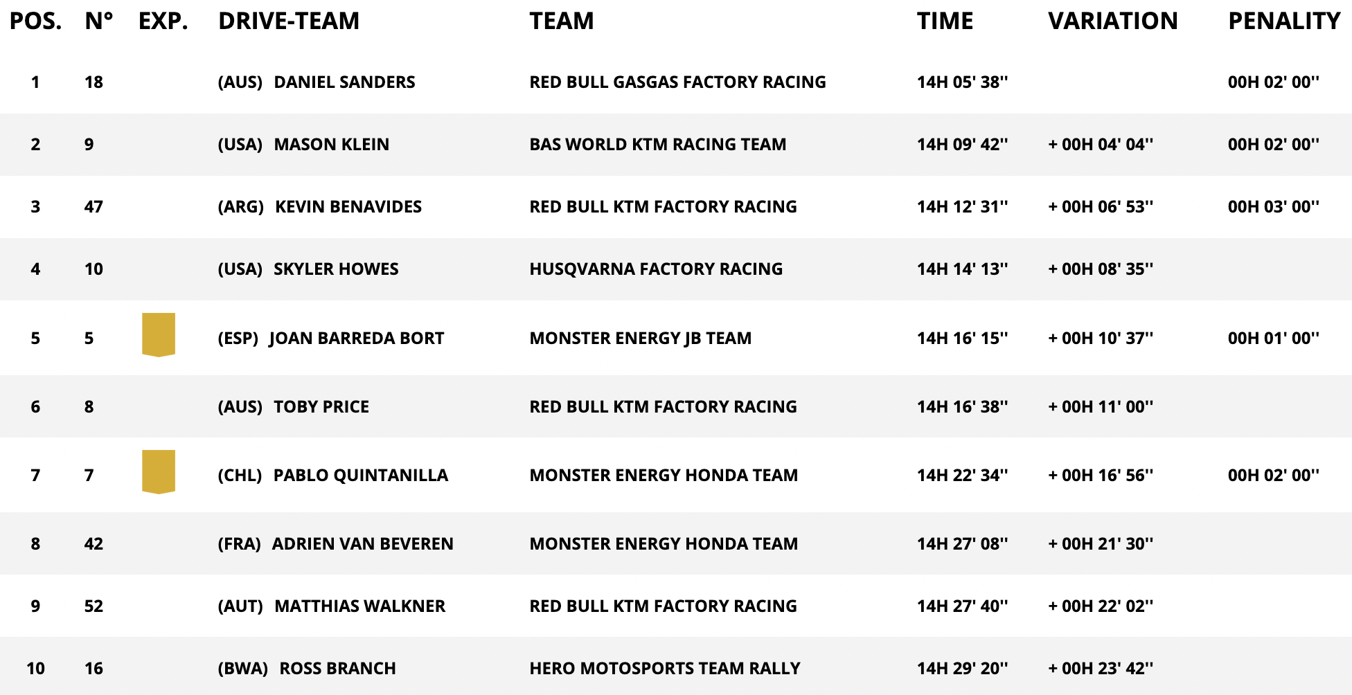 Grazie al risultato maturato nella Stage 3 è Daniel Sanders a essere tornato al comando delle operazioni nella classifica generale. L’australiano della GASGAS ha ora un margine di 4’04” su Mason Klein e di 6’53” su Kevin Benavides, 3° davanti a Skyler Howes e Joan Barreda. 6° – ma a soli 11’ di ritardo – è Toby Price, mentre Pablo Quintanilla e Adrien Van Beveren si spartiscono rispettivamente la 7ª e 8ª posizione davanti a Matthias Walkner, 9° e inseguito da Ross Branch.