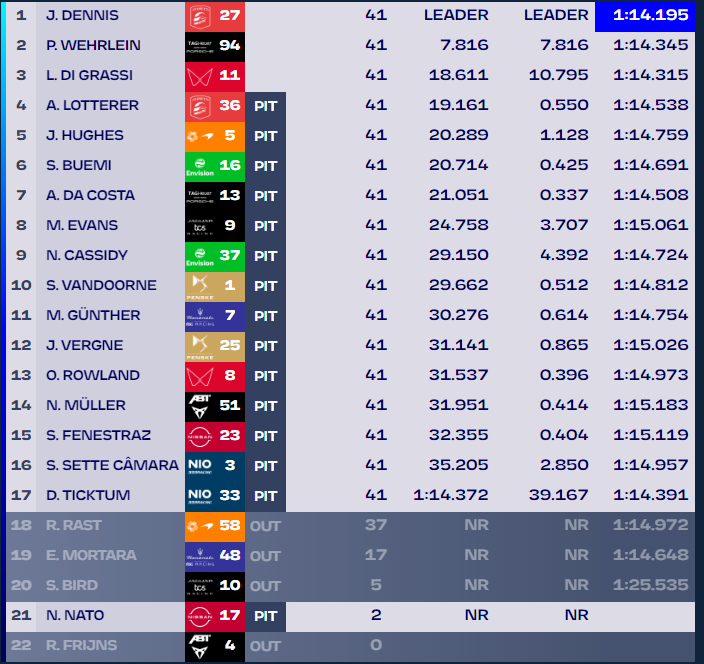 Vince quindi alla grande Jake Dennis, con la Andretti, che chiude davanti alla Porsche di Pascal Wehrlein. Entrambe le vetture sono motorizzate dalla casa tedesca, che sembra essere diventata la macchina da battere. Per Dennis questa è la quarta vittoria in carriera. Terzo è il vecchio lupo Di Grassi, al quarantunesimo podio in carriera, che è riuscito a difendersi alla grande nel finale. Chiudono a punti anche Lotterer, Hughes, perfetto all’esordio, Buemi, Da Costa, Evans, Cassidy e Vandoorne; il campione del mondo in carica chiude solo decimo un weekend molto difficile per la DS-Penske, che nonostante fossero i favoriti si sono beccati una bella doccia fredda.