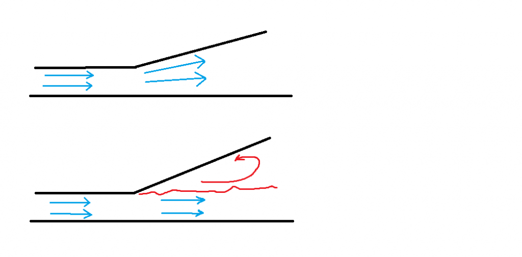 I nuovi regolamenti di F1 hanno permesso alle squadre di abbandonare il fondo piatto per passare alle cosiddette “monoposto ad effetto suolo“. Queste sono caratterizzate da una geometria sotto la vettura che prevede un ingresso e un diffusore molto più ampi rispetto all’anno scorso ed in grado di generare carico in maniera più efficiente. In generale un diffusore più ampio vuol dire maggiore espansione del flusso e di conseguenza il flusso a monte riesce ad accelerare di più. La stessa cosa vale per l’ingresso del fondo: una sezione d’ingresso ampia seguita da un canale convergente accelera la corrente. Questo perché la portata d’aria si deve conservare quindi la stessa massa deve passare in una sezione più piccola mettendoci meno tempo. Per l’equazione di Bernoulli un aumento della velocità implica una diminuzione della pressione che spinge la macchina verso il basso. Se l’angolo di espansione del diffusore è troppo elevato però il flusso non seguirà più le superfici del diffusore, ma separerà e di conseguenza l’espansione effettiva sarà molto minore. Nell’immagine sottostante possiamo avere un’idea molto generale di quello che accade. La zona rossa indica flusso separato con una zona di ricircolo.
