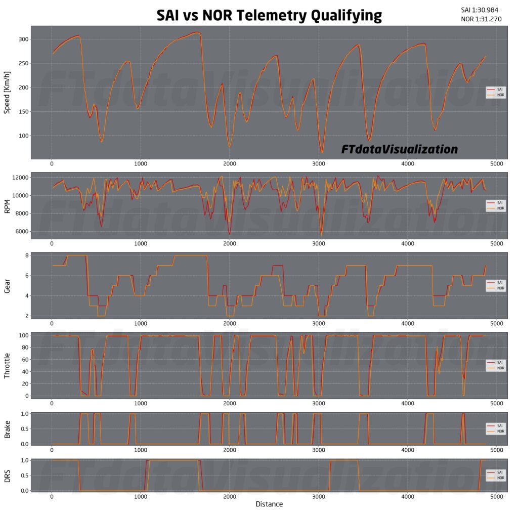 Infine Ferrari e McLaren, nonostante siano due vetture completamente diverse con la prima che privilegia l’efficienza aerodinamica e la seconda la massima downforce, appaiono incredibilmente simili su questo tracciato.