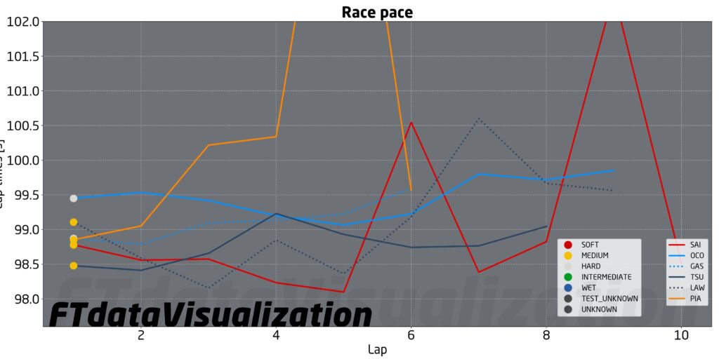 Coloro che hanno mostrato il peggior passo gara in assoluto sono state senza dubbio le due Haas e Sargeant. Sia Hulkenberg con la media che Magnussen con la soft hanno girato su tempi intorno all’1:40, solo Sargeant è riuscito a fare di peggio. Bottas e Zhou invece sono partiti molto meglio, ma poi hanno alzato notevolmente i loro tempi salendo velocemente su crono simili a quelli della Haas. Tempi oscillanti per Stroll, il quale ha alternato passaggi veramente ottimi a giri superiori all’1:42. Visto il quadro ci si aspetta quindi una Haas che non sarà in grado di reggere il passo di tutti gli altri e correrà una gara sulla difensiva cercando di perdere meno posizioni possibili.