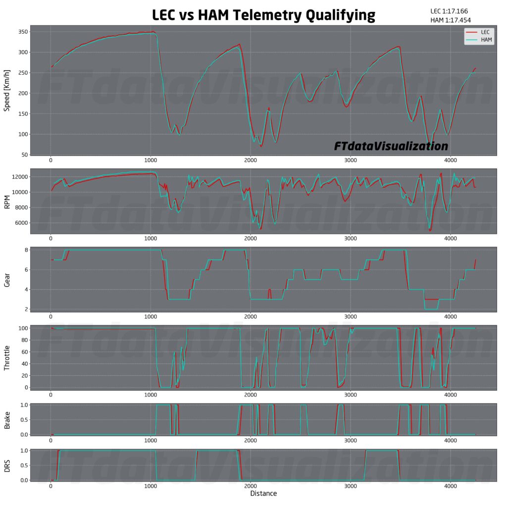 Passando alla sfida per il secondo posto nel campionato costruttori, la Ferrari è stata ancora una volta più veloce della Mercedes in rettilineo mentre la squadra tedesca, con un assetto più carico, punterà a fare meglio in gara grazie a una migliore gestione gomme. Dalla telemetria si nota come Hamilton perda in tutti i rettilinei mentre guadagni nelle curve veloci come curva 7 o curva 10, nelle quali riesce ad essere 3 e 10 km/h più veloce della Ferrari.