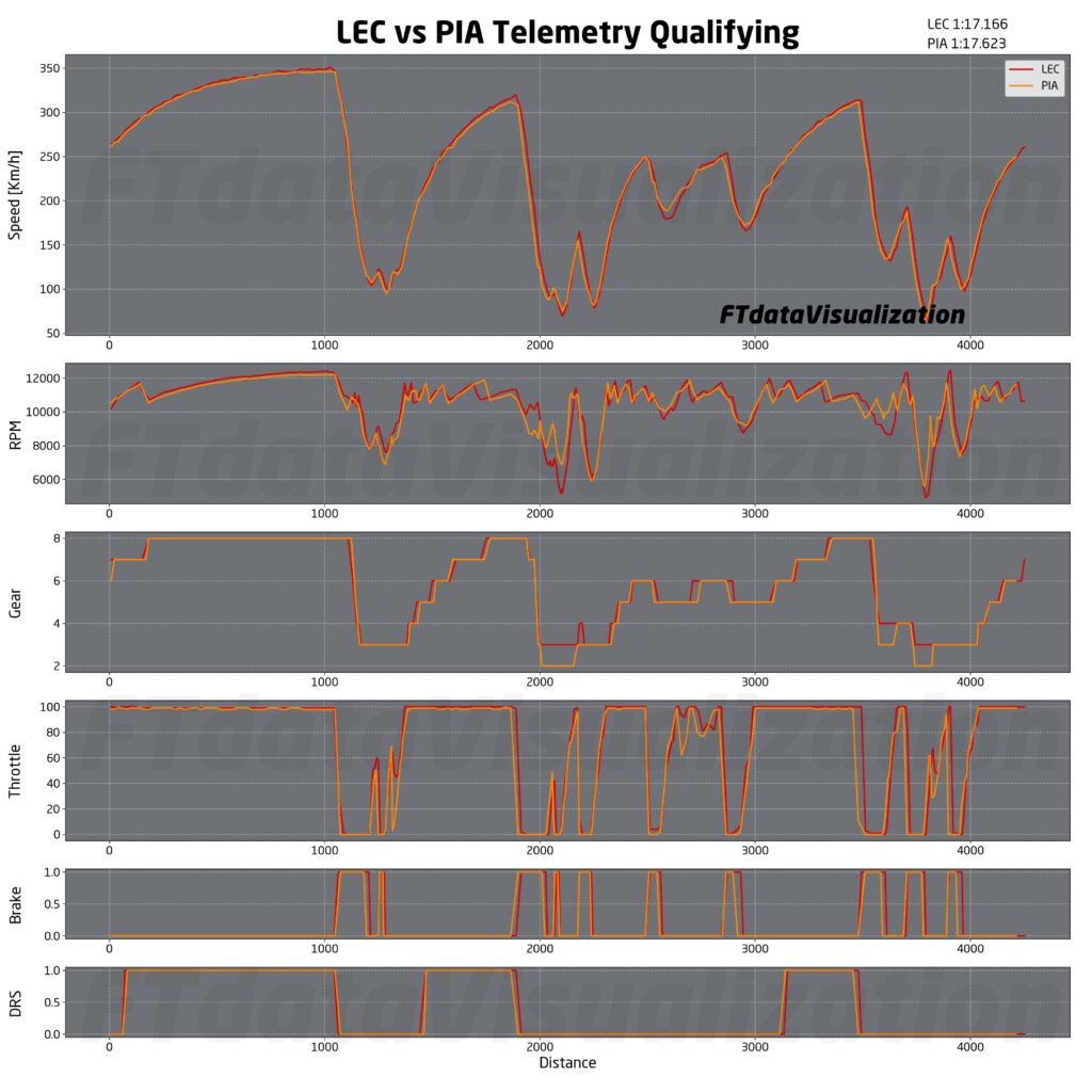 Passiamo ora alla delusione della giornata di sabato: la McLaren. Con Norris eliminato in Q1 a causa di qualche errore di troppo durante i suoi tentativi e la bandiera gialla provocata da Alonso nel corso del suo ultimo tentativo, è stato Piastri a dover tenere alto l’onore del team di Woking. L’australiano non è riuscito ad andare oltre alla settima posizione a causa di una macchina con delle ottime velocità di percorrenza curva, ma che fatica troppo in frenata e in accelerazione. Dalla telemetria si nota come le linee in uscita dalle curve abbiano una pendenza molto più bassa di quelle della Ferrari, segno di un’accelerazione minore. Anche in frenata la McLaren non è riuscita ad essere efficace come la monoposto italiana. Nonostante queste difficoltà le monoposto di Woking hanno mostrato un buon passo gara durante le PL2.
