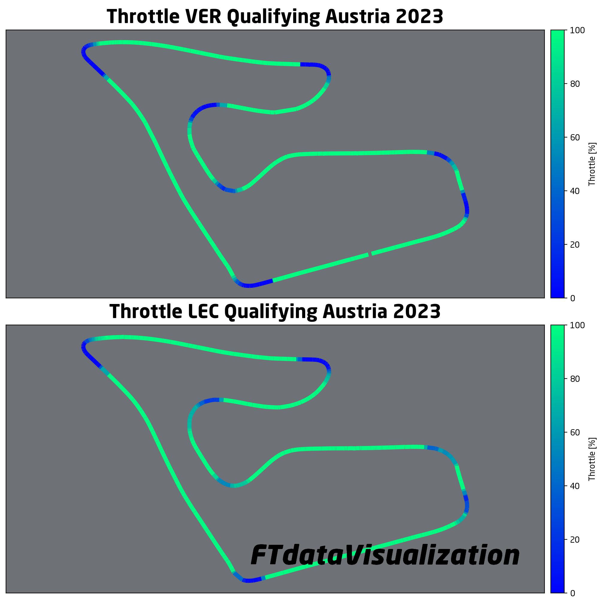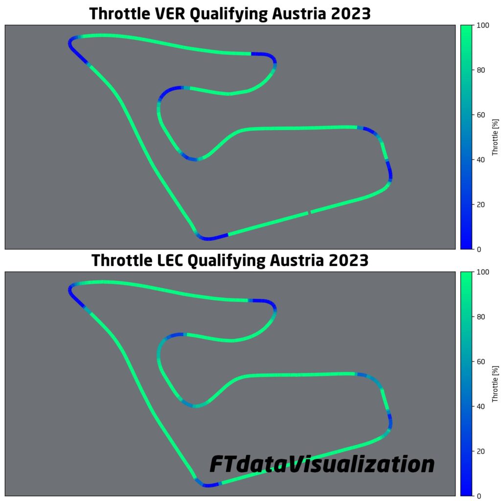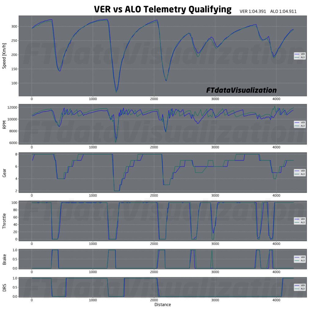 Tra gli aggiornamenti portati e un circuito che sulla carta dovrebbe essere favorevole alla rossa, la Ferrari è tornata a lottare per la pole, sfuggita a Leclerc per pochi millesimi. Max Verstappen è riuscito ancora una volta ad essere il più veloce. Guardando la telemetria si nota come le due monoposto siano state pressoché identiche sia in percorrenza curva che come velocità di punta. Le differenze più importanti si notano in curva 6 e 7, dove Leclerc è riuscito a guadagnare su Verstappen, e nelle ultime due curve dove, nonostante la maggiore velocità minima della rossa, Verstappen è riuscito a guadagnare quei millesimi fondamentali per portarsi in pole grazie a una migliore uscita. Si nota dalla telemetria infatti come Leclerc, nel tentativo di portare quanta più velocità possibile nell’ultima curva, sia costretto ad accelerare qualche metro dopo l’olandese perdendo tempo prezioso.