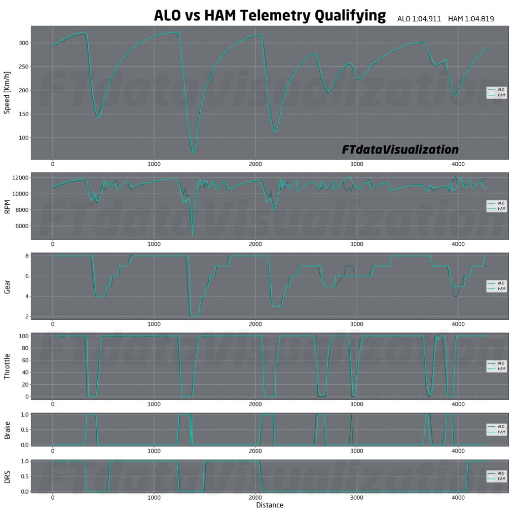 Mercedes su un livello simile ad Aston Martin, almeno con il sette volte Campione del Mondo Lewis Hamilton. La telemetria dell’inglese ricalca quasi perfettamente quella dello spagnolo salvo qualche piccola differenza in curva 9. Poco da dire in questo caso.